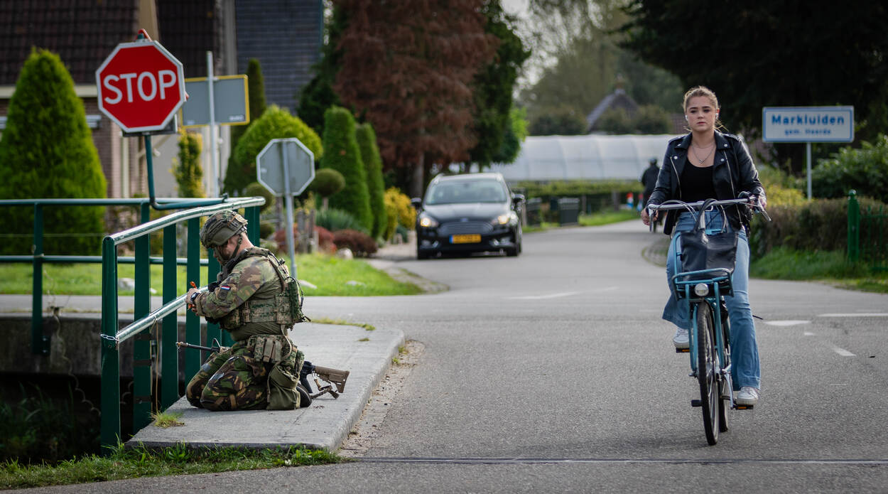 Alsof hij er niet is. Kennelijk denkend aan iets anders trapt een dame langs een militair bij een brug over het Apeldoorns Kanaal bij Heerde. De landmachter doet mee aan de oefening Victorious Engineer van 41 Pantsergeniebataljon die het oefenterrein Wezeperberg en Heerde in zijn greep houdt. Eén van de opdrachten: ‘vernietig’ deze brug. Het materiaal daarvoor lag opgeslagen in een dump, een begrip binnen de genie. Het is dé plek waar alle voorraad ligt. Foto Martin Bos (defensiefotografie.nl)