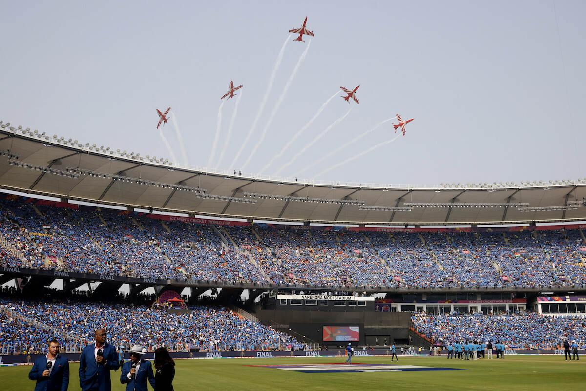 Als je twee liefhebberijen kunt combineren in een foto, waarom niet? Die kans komt immers niet elke week voorbij. Onlangs was in India de finale van het wereldkampioenschap cricket tussen het gastland en Australië. De 130.000 (!) knotsgekke toeschouwers kregen vlak voor het begin een wervelende show van Suria Kiran. Dit demonstratieteam van de Indiase luchtmacht vloog met hun BAE Hawk’s Mk.132 een aantal keren over het stadion. Veel geluk bracht het de tot dan ongeslagen cricketploeg van India niet, want Australië pakte vrij onverwacht de winst. (Voor wie er niets van heeft meegekregen: ook Nederland deed mee aan dit WK en bepaald niet onverdienstelijk. Daar zaten weliswaar geen militairen bij, maar tot in de jaren 70 was er wel degelijk een Nederlands militair cricketteam actief.) De foto is gemaakt door een fotograaf van de Indiase luchtmacht.