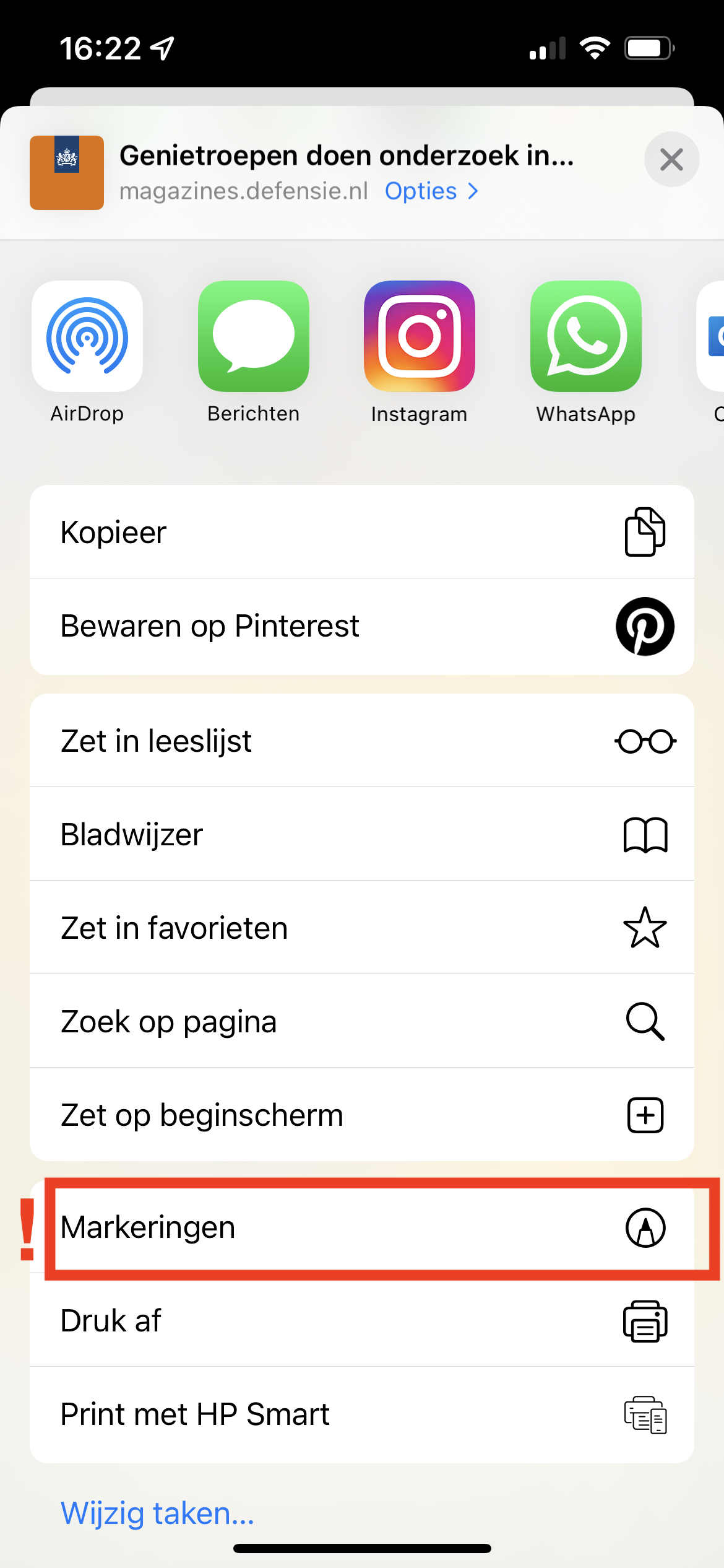 Open via Safari het verhaal uit de Defensiekrant waarvan u een kopie wilt maken. Druk daarna onderin het scherm op het vierkantje met het pijltje omhoog.