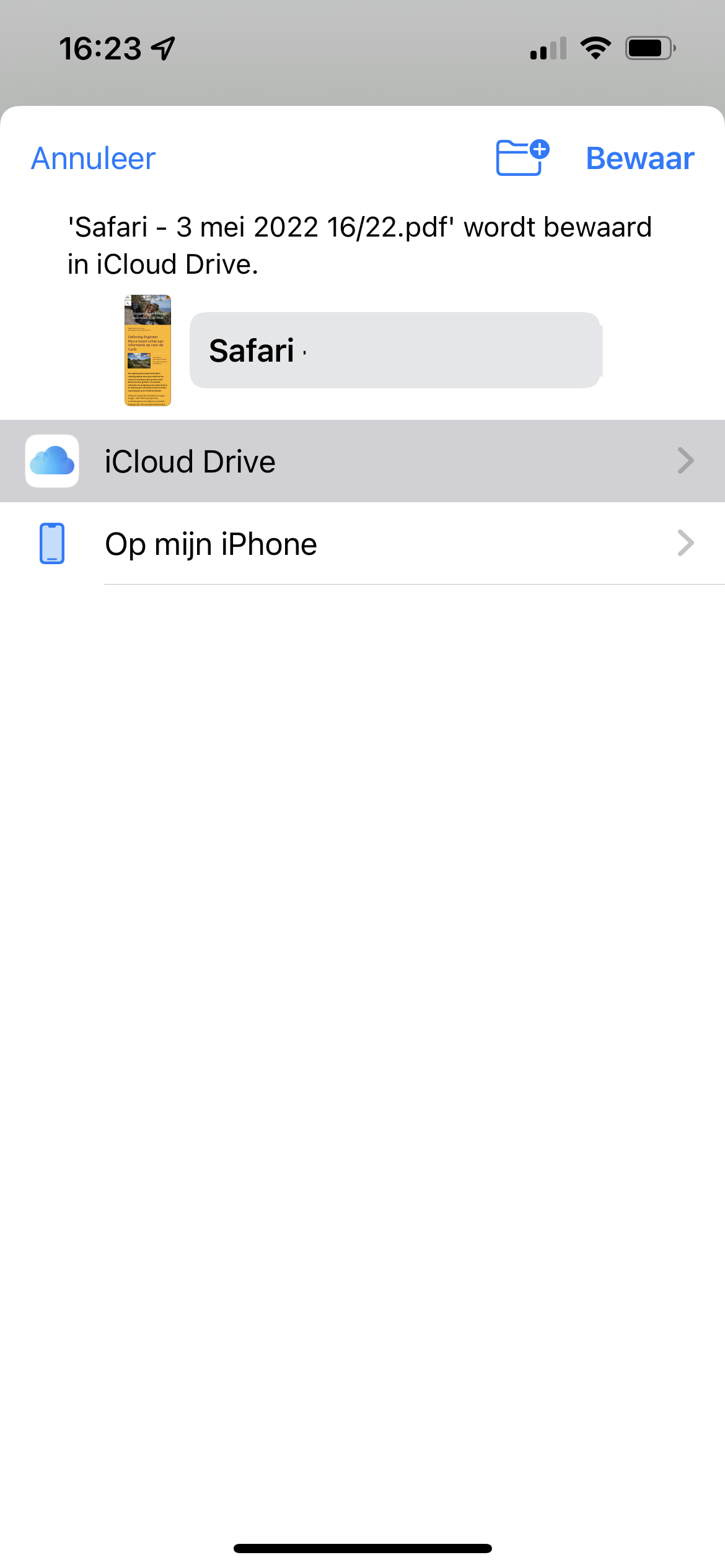 Vervolgens kunt u de PDF van de pagina opslaan op uw iPhone en iPad (openen via de app ‘Bestanden’) of sla het op in de iCloud. Als u voor deze laatste optie kiest dan zal de kopie ook verschijnen op alle andere apparaten waarop u met dezelfde iCloud bent ingelogd. Dat kan ook een laptop of computer zijn.