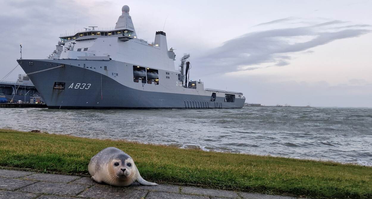 Donderdag 21 december 2023. Storm Pia raast over het land en de zee. Zeker in Den Helder. Komt die dekselse Klaas Heiligenberg op de lijn dat hij een mogelijke spion in de Nieuwe Haven op de foto heeft gezet, met Zr.Ms. Karel Doorman op de achtergrond. Maar dan moet je bij de MIVD zijn en niet bij LENS! Maar de vreemdeling die Klaas op de gevoelige plaat vastlegde is duidelijk geen onderdeel van een vijandige krijgsmacht. Gedwongen door hoogwater zocht de zeehond even beschutting tegen de wind. We hopen dat het dier een beter lot treft dan een illustere voorganger, wijlen walrus Freya. Zij heeft door haar avonturen in de havens in Noord-Europa als enige walrus dan wel weer een eigen pagina op Wikipedia.