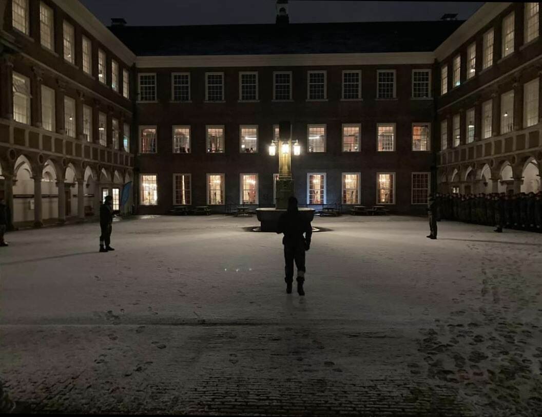 “Het heeft iets magisch om zo je dag te beginnen”, schrijft luitenant-kolonel Mostafa Hilali bij de door hem ingezonden foto. En gelijk heeft-ie. Afgelopen maandagmorgen lag een dunne witte deken over de appelplaats van de Koninklijke Militaire Academie in Breda, beter bekend als ‘Het Kasteel’. Het cadettenbataljon stond daar opgesteld om de week en de opleiding te beginnen. En daar word je zelfs op ‘blauwe maandag’, de volgens kenners depressiefste dag van het jaar, alleen maar blij van.