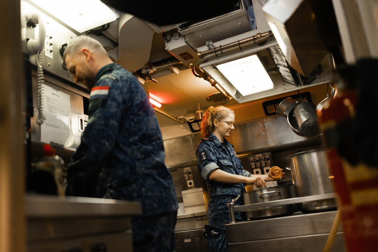 Voor Myrthe is het al helemaal de gewoonste zaak van de wereld. Met een kersvers MBO-diploma Banketbakker op zak stapte ze meteen bij de Onderzeedienst naar binnen. “Iedereen aan boord wil je helpen”, zegt ze. Zij voelt zich daardoor thuis op Zr.Ms. Dolfijn. “Ik ben pas een week of vier op zee geweest, maar dat is zeer goed bevallen. We zijn met vier vrouwen aan boord.”