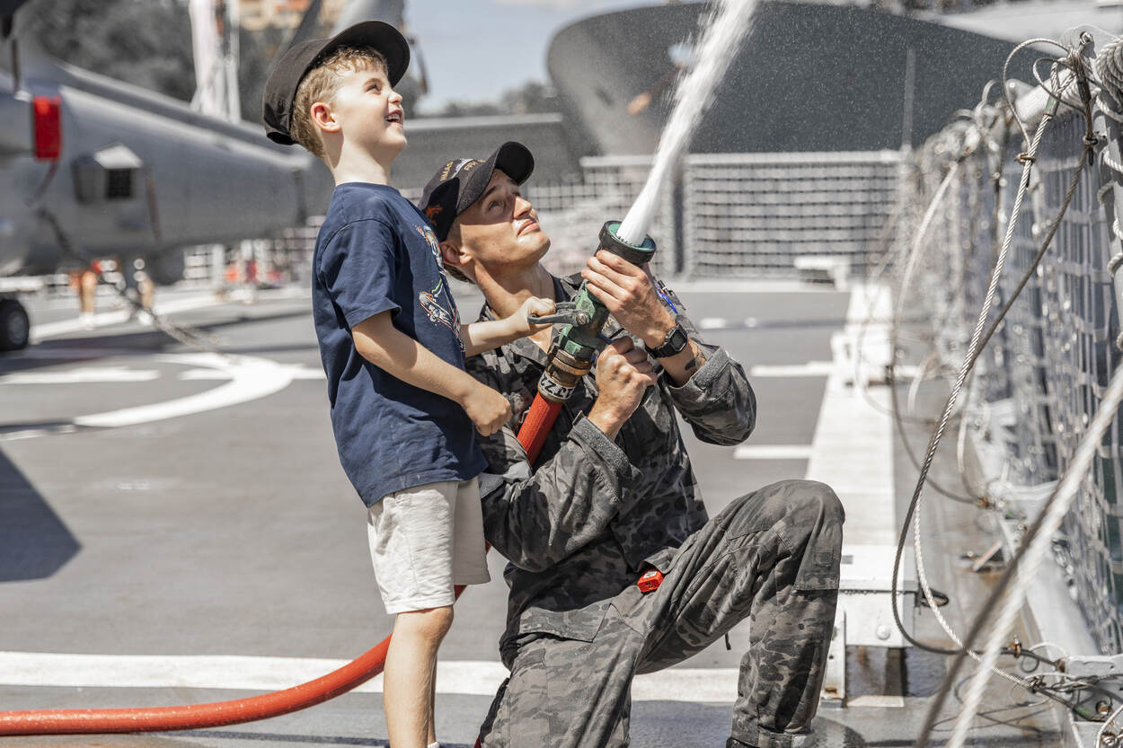 Kinderboekenschrijfster Annie M.G. Schmidt dichtte ooit ‘Met hun bollen op het kussen, dromen zij van branden blussen’ in het gouden boekje ‘Vijf Brandweermannetjes’. Wellicht dat het ventje op deze foto van Lucinda Allisson ’s avonds ook spannende avonturen heeft beleefd in zijn slaap, na zijn avontuur op HMAS Arunta. Hij mocht matroos Peter Mason assisteren bij de demonstratie van brandbestrijding aan boord. Deze week hadden de marinedagen in geheel Australië plaats. Vandaag, 1 maart, viert het varende krijgsmachtdeel de 123ste verjaardag. HMAS Arunta, een fregat van de Anzac-klasse, lag tijdens de open dag in de marinehaven van Sydney, New South Wales.