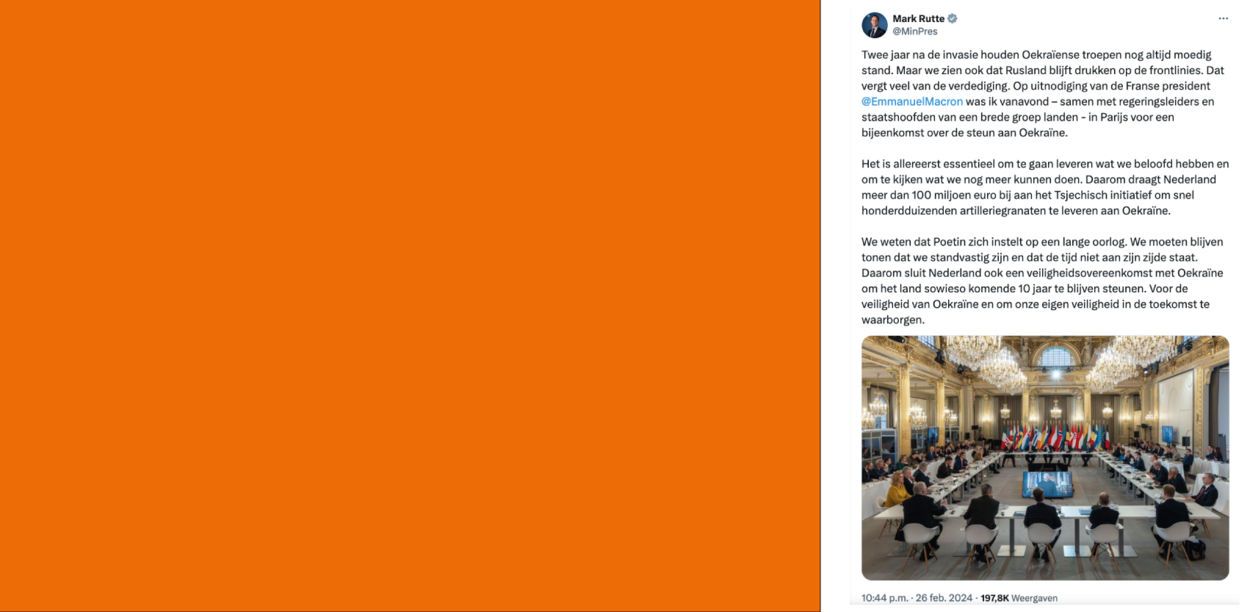 “Het is allereerst essentieel om te gaan leveren wat we beloofd hebben en om te kijken wat we nog meer kunnen doen”, reageerde demissionair premier Mark Rutte maandag op X. Het gaat volgens een woordvoeder om nieuw geld waar afgelopen week overeenstemming over is bereikt.