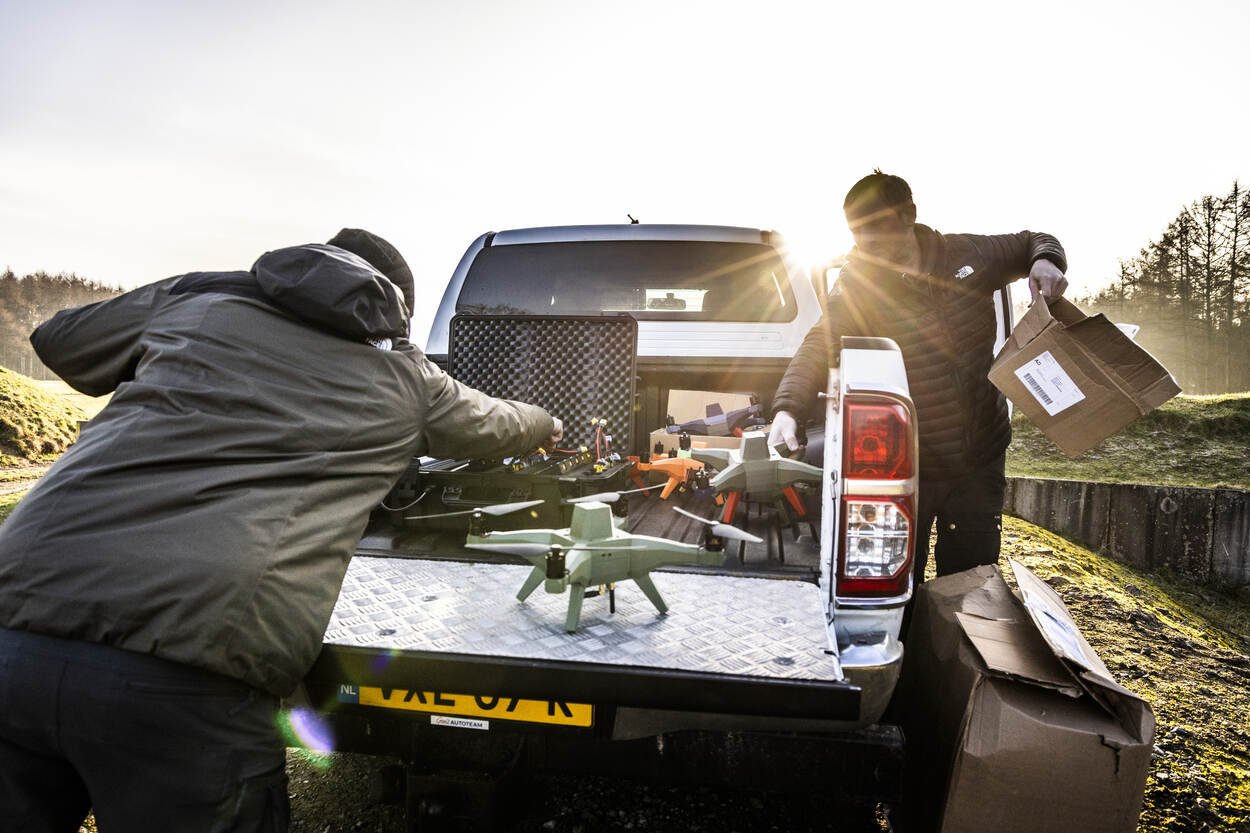 Medewerkers van leverancier BSS Holland maken de oefendrones gereed voor inzet tijdens de oefening.