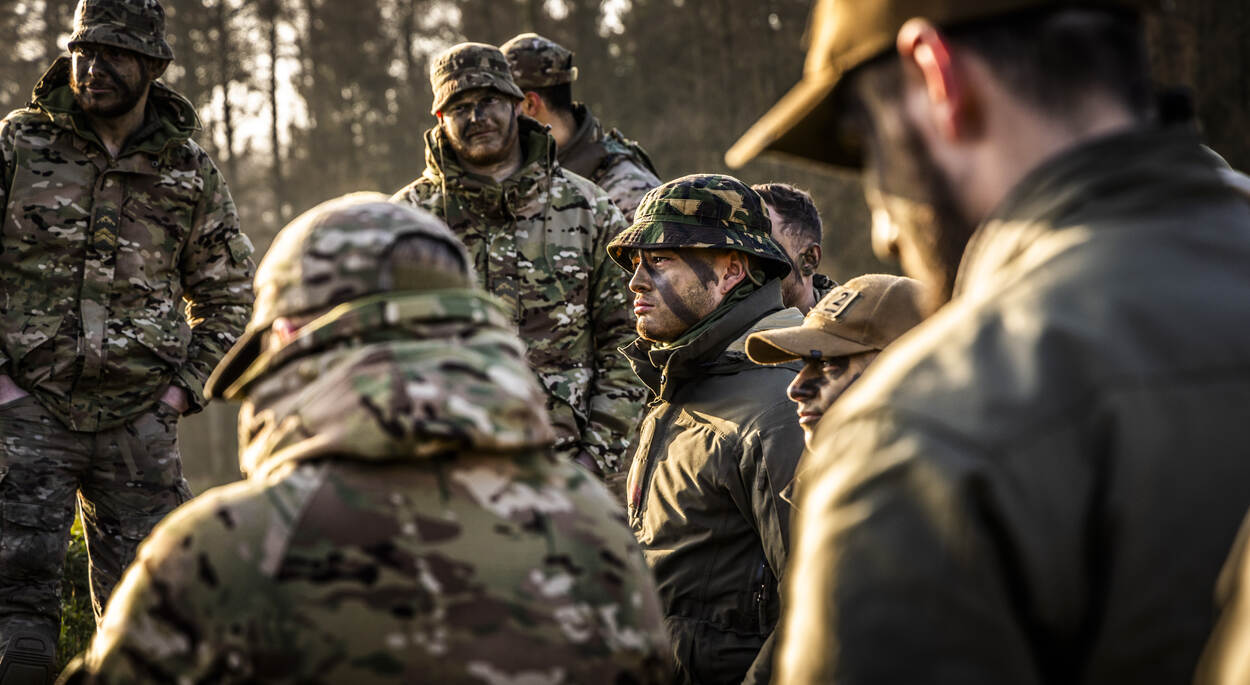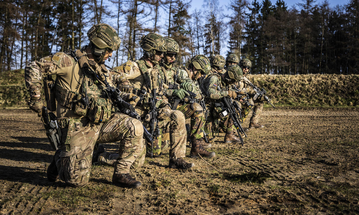 De eerste groep maakt zich klaar om het veld in te gaan. Het uit de lucht schieten van de drone is volgens sergeant-majoor Roel Hoogervorst maar een klein deel van de oefening, dat je relatief snel onder de knie hebt. “Terwijl het tactische deel telkens terugkomt op verschillende niveaus, door de jaren heen. Denk daarbij aan: hoe manoeuvreren we als groep, wie doet wat als er een drone aan komt of welke wapens gebruiken we op welk moment op welke vijand.”
