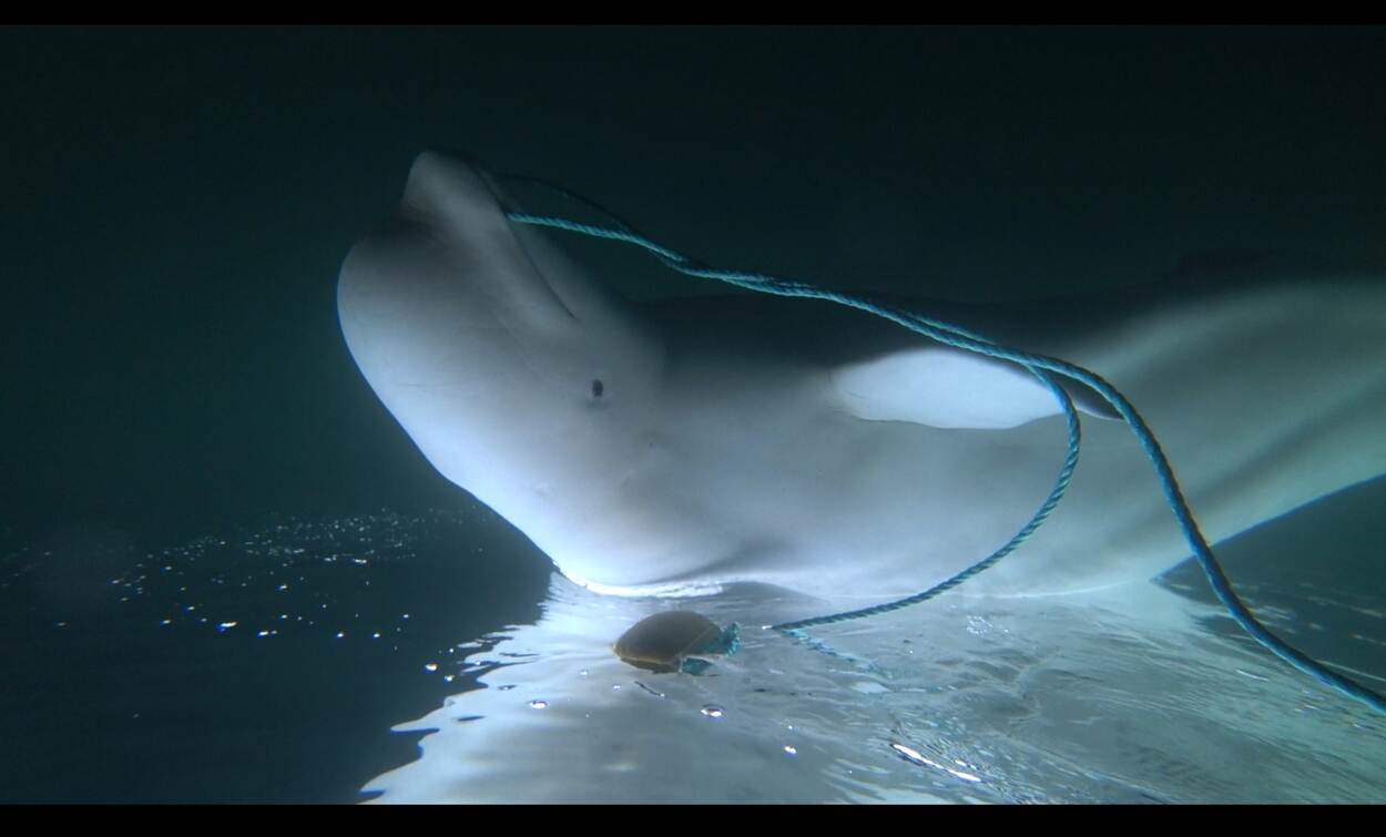 Het is april 2019 als een wit schepsel in zee de aandacht van een Noorse vissers trekt. Walvissen komen hier in het noordelijkste puntje van de wereld wel vaker voor, maar zo nadrukkelijk vlakbij de mensen? Dat is vreemd. De witte beloega lijkt verstrikt te zitten in een net. Om het dier te bevrijden hijst een van de vissers zich in een rood, waterdicht pak en springt het water in. Het dier schrikt niet. Het menselijke gezelschap lijkt hem juist te animeren.