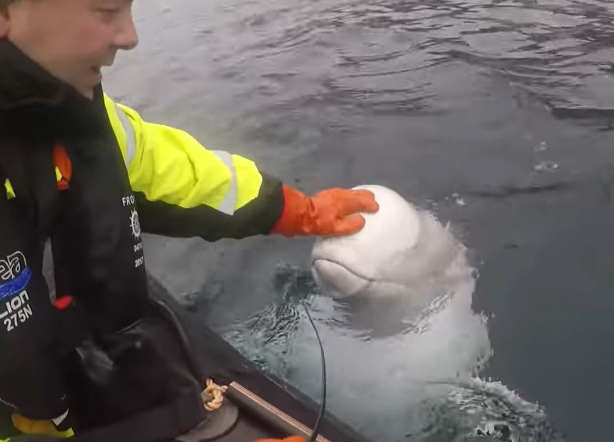 De visser snijdt het net kapot, dat erg lijkt op een tuigje. Hij neemt het mee aan boord en seint de instanties in over zijn ontdekking. De Noor Tor Arlid Guleng uit Hammerfest hoort het nieuws en besluit om naar het dier op zoek te gaan. “Het was best wel cool om hem in zee te zien zwemmen, maar het was overduidelijk geen ‘wild’ dier. Toen mijn vrouw en ik weer wegvoeren, bleef hij onze boot volgen terwijl we niks speciaals deden”, vertelt Tor tegen de Defensiekrant.