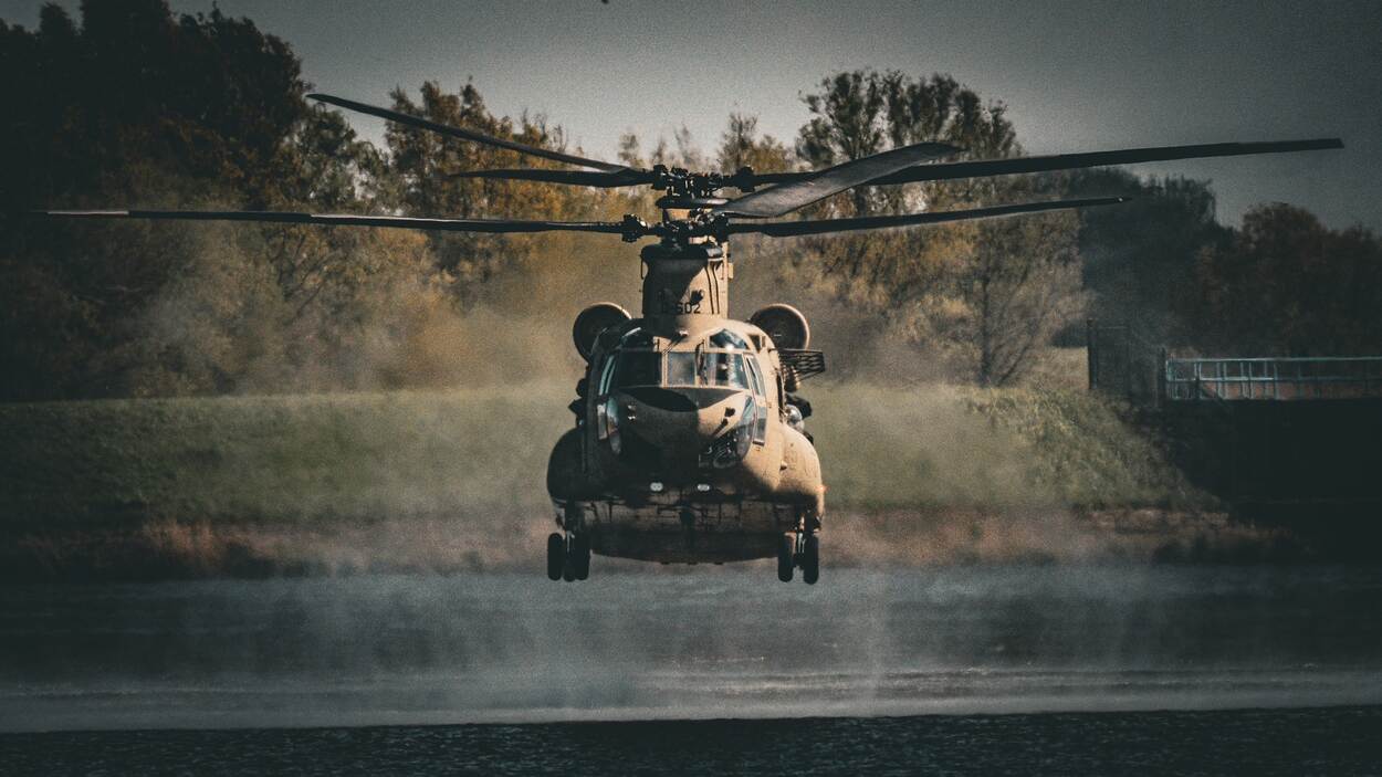 Nietsvermoedend reden Luc Reichgelt en een vriend afgelopen 10 april over de A27 richting België, toen ze bij Keizersveer een Chinook laag zagen aankomen. De transporthelikopter begon aan een landing in een nabijgelegen weiland. Het tweetal ging er meteen op af. “We waren er net, toen de Chinook weer wegvloog. Maar niet voordat we deze foto konden nemen.” Per toeval stonden de mannen hiervoor op het juiste moment op de perfecte plek.
