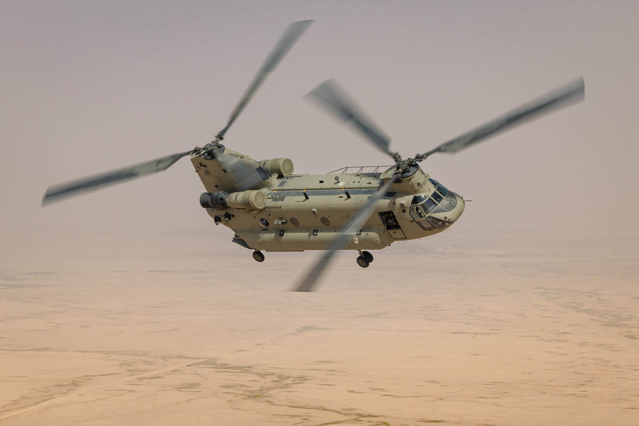 Volle bak ertegenaan in de verzengende hitte van Irak. Een jaar lang worden drie CH-47F Chinook MYII CAAS-transporthelikopters en het personeel van het Defensie Helikopter Commando (DHC) ingezet voor twee missies in Irak.