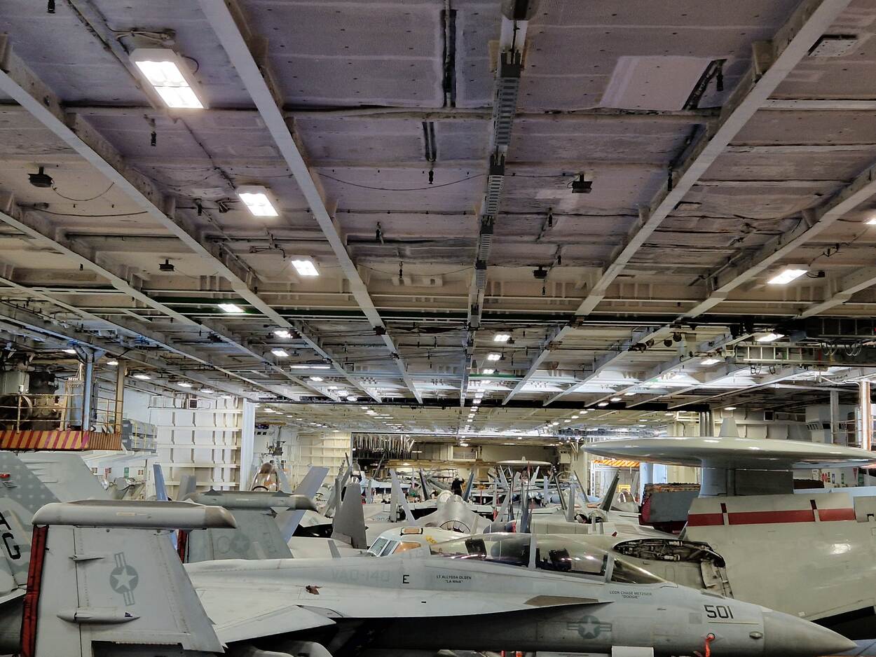 Daar is niets aan gelogen. De USS George Washington is met 333 meter anderhalf keer zo groot als Zr.Ms Karel Doorman, het grootste schip van de Nederlandse marine (204 meter). Er gaat zeventigduizend dollar aan voeding per dag doorheen en achterop het schip kan men in de ‘jet engine repairshop’ vliegtuigmotoren tot 2,5 meter volledig binnenstebuiten keren en weer gereed maken voor inzet. Verder staan aan boord op dit moment een kleine veertig F-35’s en F-18’s gevechtsklaar paraat. “En dat zijn ze nog niet eens allemaal. Normaliter zijn het er negentig. Veel meer dan wij in totaal hebben.”
