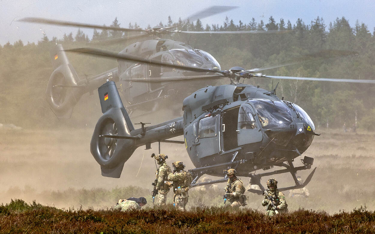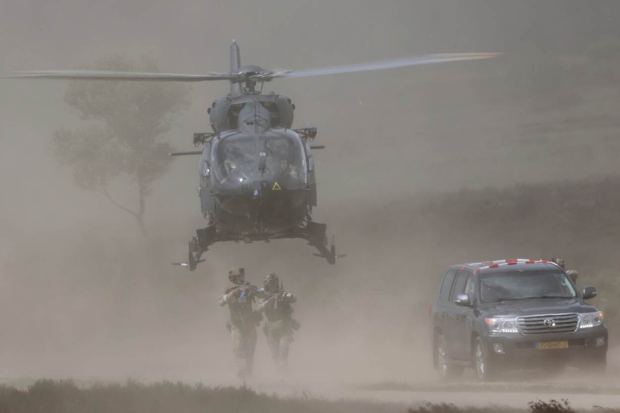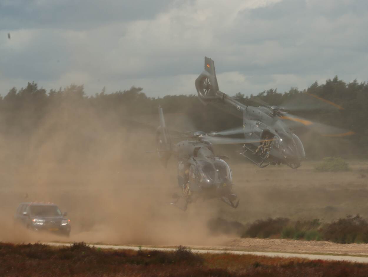 Vliegtuigspotters Bert van der Linden en Gerard van der Lit fotograferen graag militaire luchtvaart, liefst in actie uiteraard. En spectaculaire actie kreeg het tweetal onlangs op en rond de Eder Heide. Daar oefende 300 Squadron van Vliegbasis Gilze-Rijen met het Duitse Hubschraubergeschwader 64 van de vliegbasis Laupheim. De helikopterbemanningen voerden met het Korps Commandotroepen een zogenoemde carblock uit, waarbij een automobilist tot stoppen wordt gedwongen met het doel de inzittenden te arresteren. Het ingestuurde beeld dat Bert net na de actie maakte is indrukwekkend (foto boven), maar helaas is van de arrestatie niets te zien door de grote stofwolk. Daarom vroeg hij collegaspotter Gerard van der Lit, die op een andere positie minder last had van het stof, ook een foto in te sturen (foto beneden). Bert en Gerard, dank voor de prachtige beelden.