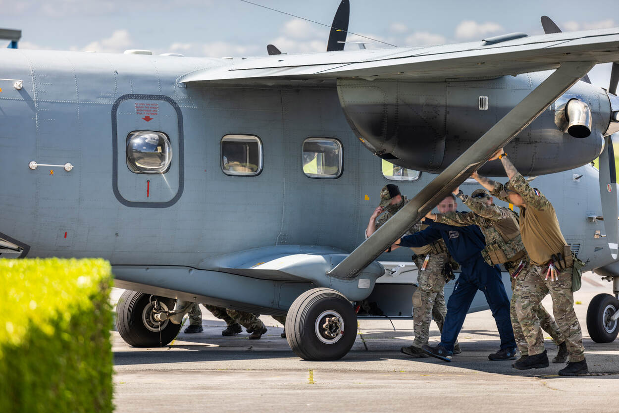 Het ziet er wellicht wat klungelig uit. De bemanning van een M28 Skytruck die samen met Nederlandse militairen een vliegtuig naar de startbaan duwt. Onze 'noordelijke' fotograaf Jarno Kraayvanger legde het beeld vast op het Groningse Oostwold Airport. Daar hielden de Rangers van de Luchtmobiele Brigade een oefening samen met commando’s van 103 Commandotroepencompagnie. Na het bijtanken kan het toestel niet zelfstandig draaien, dus daar kwamen de spierballen van de Rangers goed van pas.