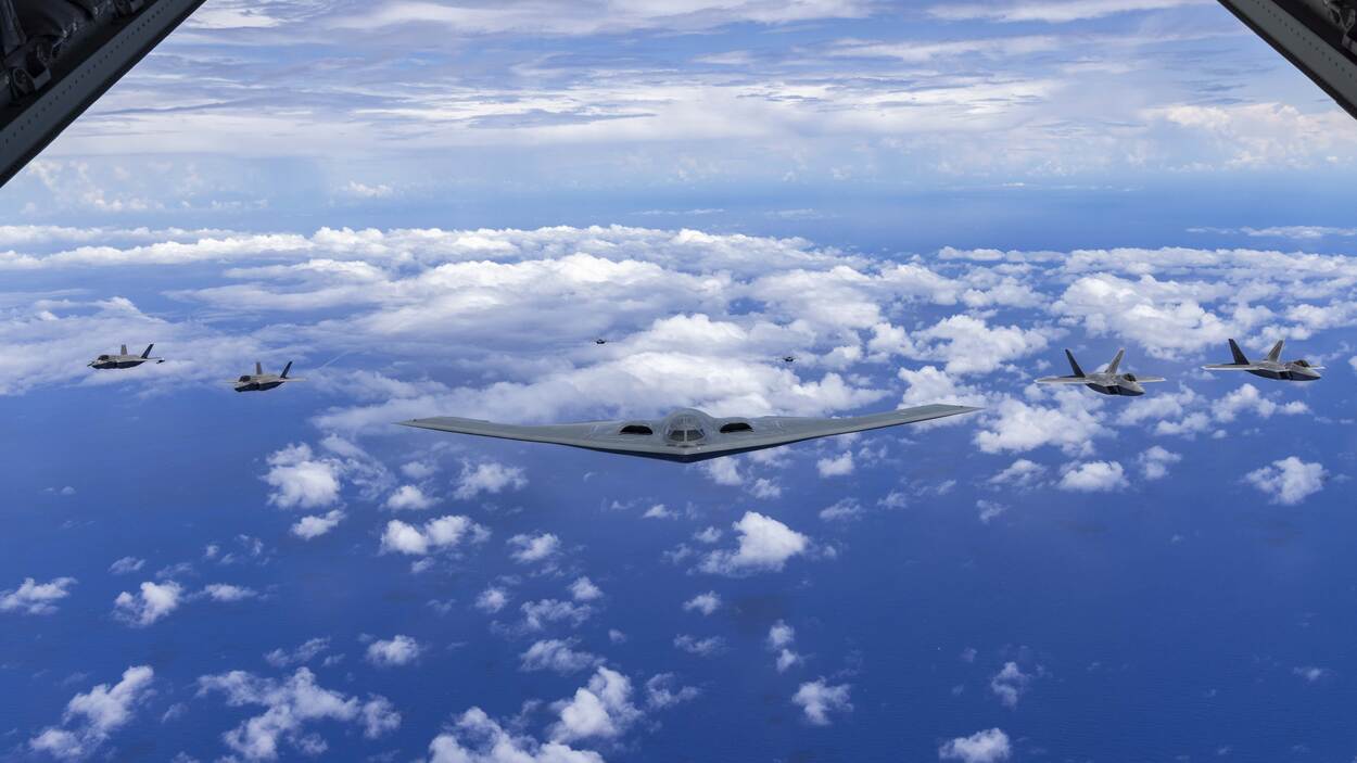 Het is altijd een spectaculair gezicht, een vliegende B-2 Spirit. Sergeant Jose Angeles kreeg ‘m voor de camera boven de noordelijke Stille Oceaan. En dan zijn er ook nog F-22 Raptors (rechts) en F-35's in beeld. Mooier kun je het op dit moment bijna niet krijgen. De vliegtuigen namen deel aan een grootschalige gezamenlijke oefening rond Guam, Palau en de Noordelijke Marianen, een eilandengroep ten noorden van Guam.