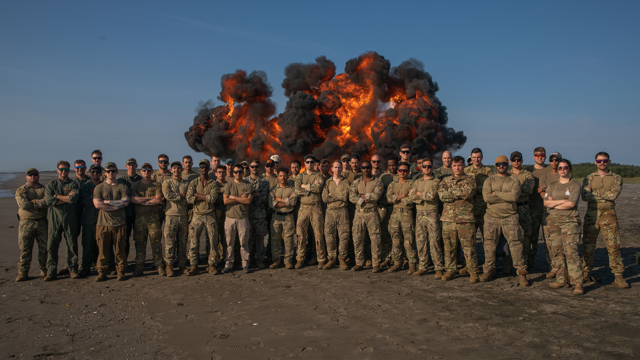 Wat militaire oefeningen betreft gebeurt er momenteel heel wat in de wereld. Veel daarvan kennen we wel, maar Tanuki Bandit…? Nee, die is zelfs voor de veteranen bij ons Mediacentrum Defensie onbekend. Het blijkt te gaan om een jaarlijkse bijeenkomst voor explosievenexperts van US Marines en Air Force. De deelnemers poseren voor een groepsfoto na een oefening op Draughon Range bij Aomori. Met, om de Baron uit Bassie en Adriaan te citeren, een grote boem op de achtergrond. De foto is van sergeant Lance Kell.