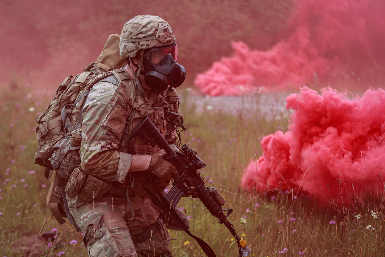 Sergeant Noah Cumming van de Amerikaanse landmacht heeft zijn gasmasker maar eens opgedaan. Je zou bijna denken dat hij deel uitmaakt van het Holifeest, het kleurrijke lente- en nieuwjaarsfeest van de Hindoestanen. Maar aangezien die viering in maart plaatsheeft en deze foto pas een paar dagen oud is, moet er iets anders aan de hand zijn. En dat is ook zo: de militair deed mee aan een gevechtsoefening met traangas op oefenterrein Grafenwöhr in Duitsland. Samuel Signor is de fotograaf.