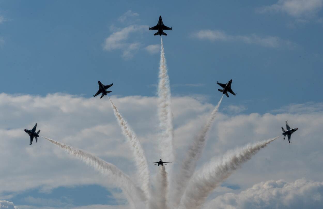 Het United States Air Force Air Demonstration Squadron, beter bekend als Thunderbirds, heeft op 4 juli een fraaie show uitgevoerd in Battle Creek, Michigan. De F-16 Fighting Falcons vormden het hoofdprogramma van de Battle Creek Field of Flight Air Show, waar ook een ballonfestival en de Fourth of Flight Air Show toe behoorden. (Foto: sergeant Dakota Carter)