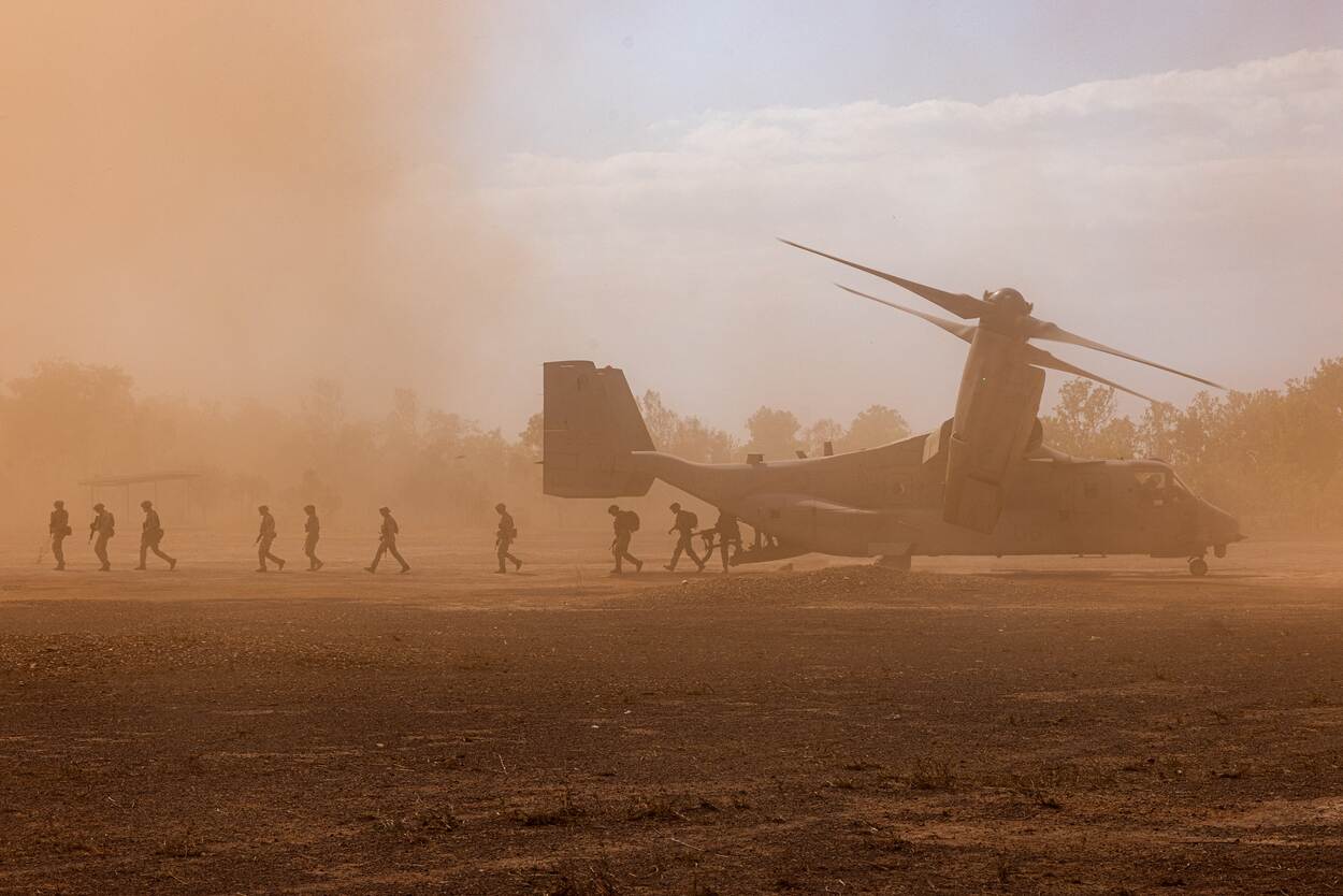 De jaarlijkse oefening Predators Run voor special forces in Australië levert altijd fraaie platen op. Op deze foto van Juan Torres stappen Britse Royal Marines Commandos van 40 Commando Group uit een MV-22B Osprey van het Marine Medium Tiltrotor Squadron 268.