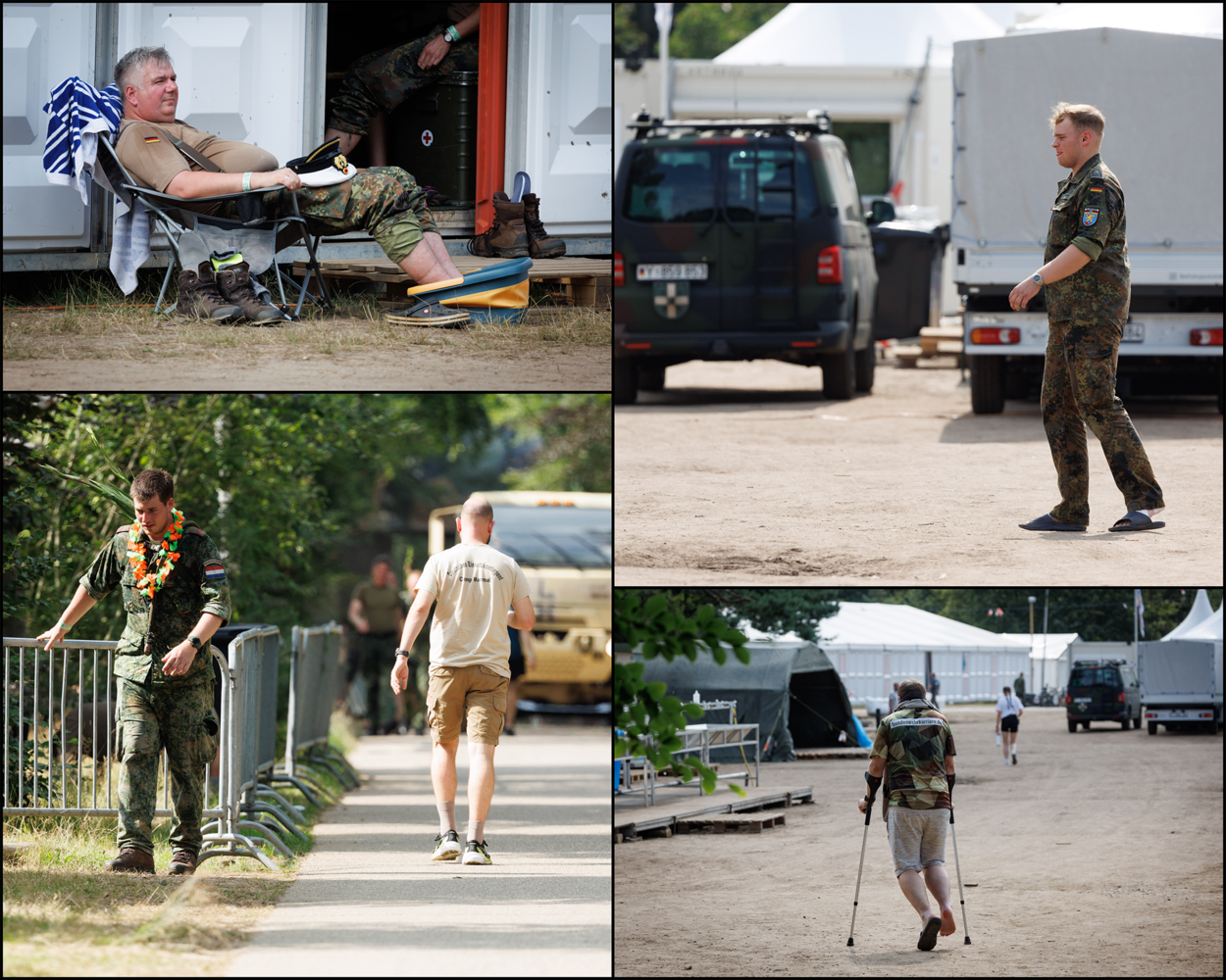 Even na het middaguur rijdt een grote bus Kamp Heumensoord op. Oude heren, keurig in pak, stappen uit. Het is een groep veteranen van Militair Tehuis Bronbeek die vandaag een kijkje komt nemen op Heumensoord. Vanaf het podium klappen ze de hele middag voor binnenkomende detachementen. Rond 16:15 uur worden ze in ganzenpas de biertent ingeloodst, waar iedereen hen een warm applaus geeft. De dag telt uiteindelijk 819 uitvallers. Een jaar eerder waren dat er op dag één 732.