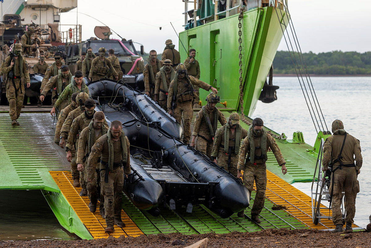 Die oefening op het zuidelijk halfrond en de aanwezigheid van militairen op Melville-Eiland levert meer mooie foto’s op. Hier draagt het 5e bataljon van het Royal Australian Regiment Zodiacs uit het schip de Jane Virgo. Dat had net aangelegd op de Tiwi-eilanden, Northern Territory.