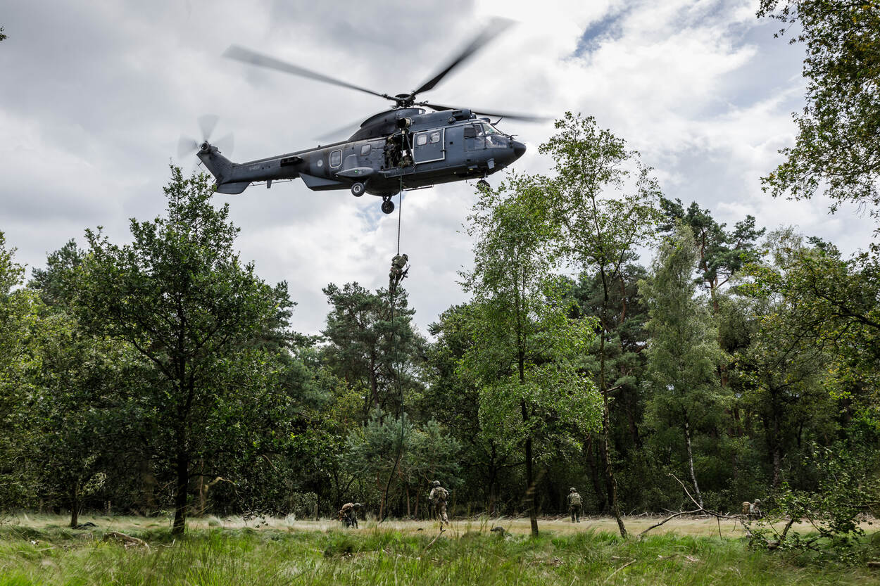 Ben van den Boomen laat er geen gras over groeien. Na zijn eerste bijdrage in de vorige editie van LENS!, waarvoor dank, spoedde de fotograaf zich naar Weert voor de oefening Joint Falcon 2024. Op de Kruispeel in Limburg zette hij deze Cougar op de plaat, waaruit militairen van de Luchtmobiele Brigade kwamen afdalen. Fastropen in vaktaal. “Daarna moesten ze door een bosgebied met vijandig contact lopen en een gebouw innemen”, aldus Ben, die ook als verslaggever zijn mannetje staat.