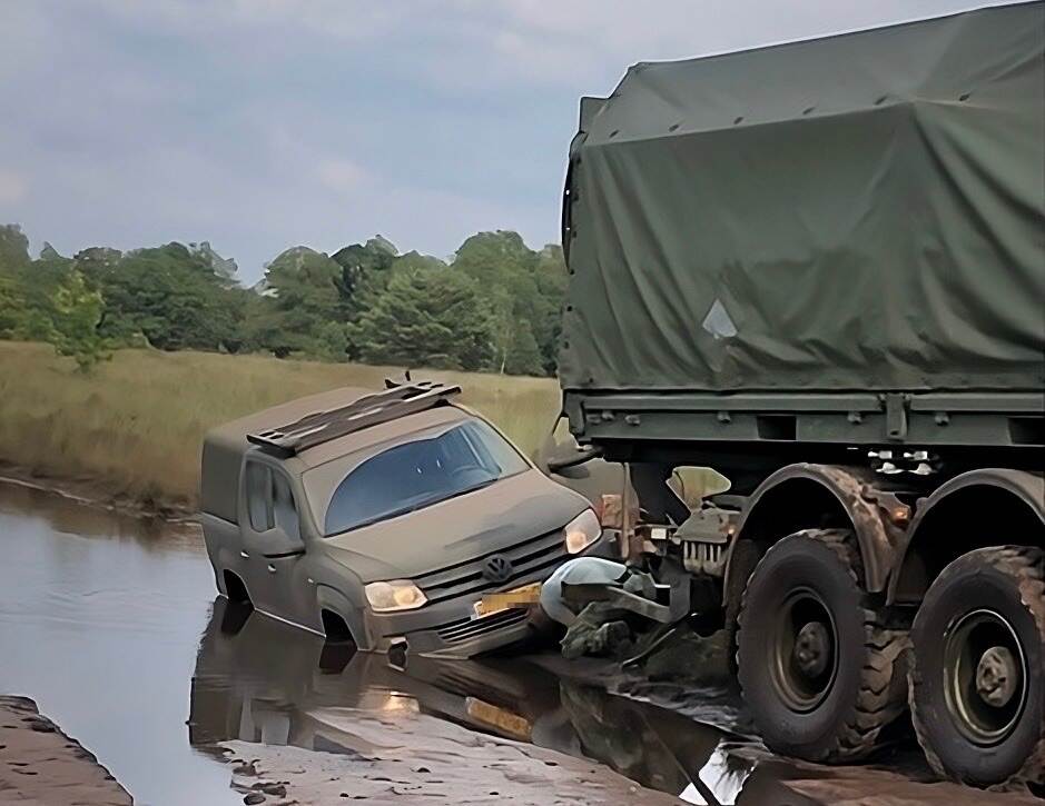 Henk en Maria Beecks liepen samen al ‘Door de Bossen, door de Heide’ zingend hun dagelijkse rondje over de Oirschotse Heide, toen ze opeens een Amarok zagen vastzitten in een grote plas. Gelukkig was er voor dit voertuig van het Korps Mariniers hulp nabij en hoefden Henk en Maria hun wandeling niet te onderbreken om te duwen, en konden ze deze foto schieten. De redder-in-nood moest wel even door het stof om de trekkabel goed aan te sluiten.
