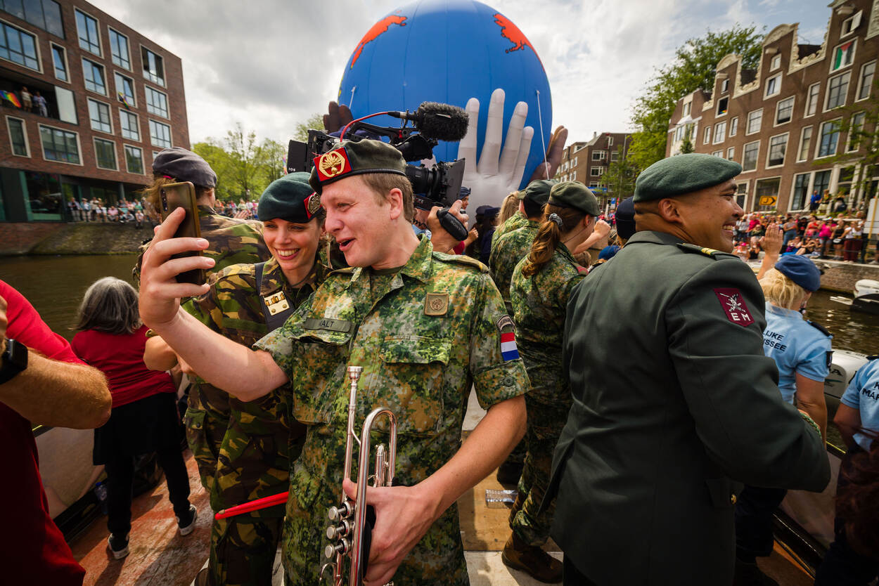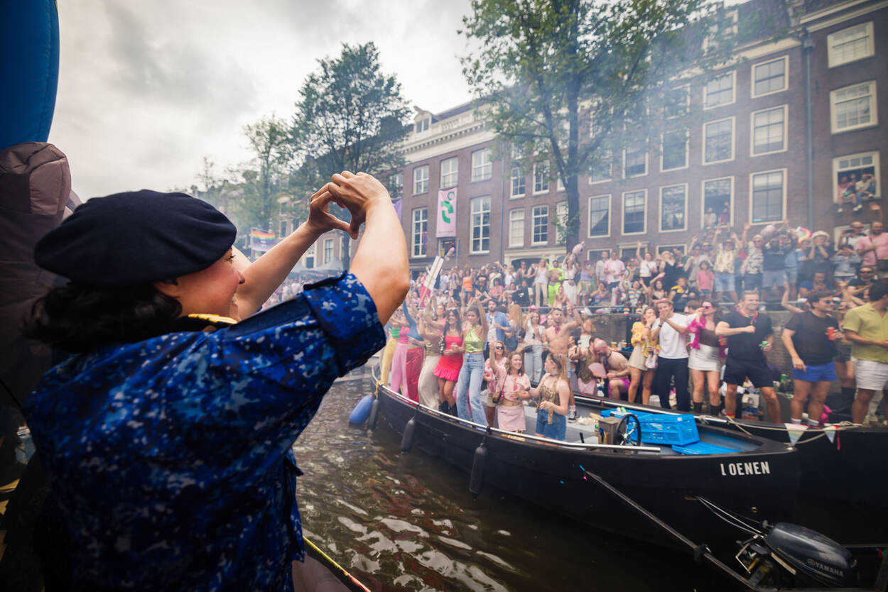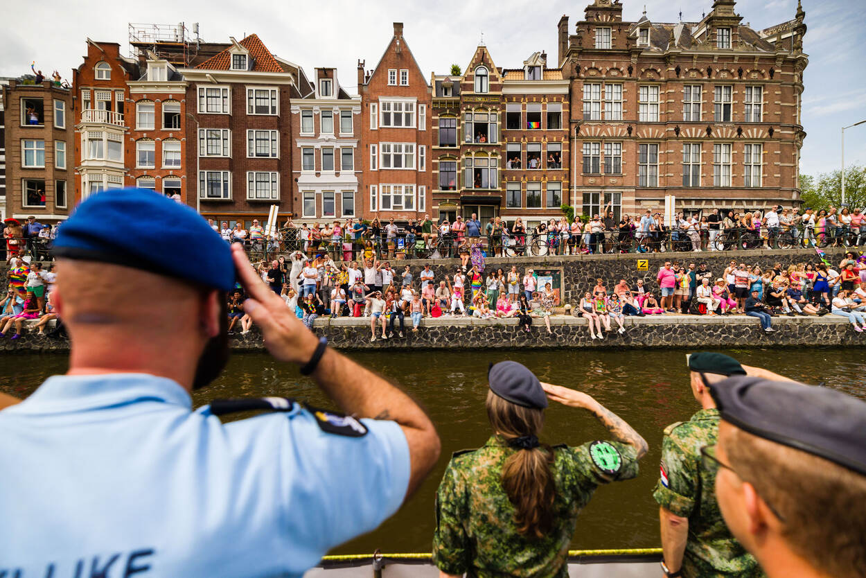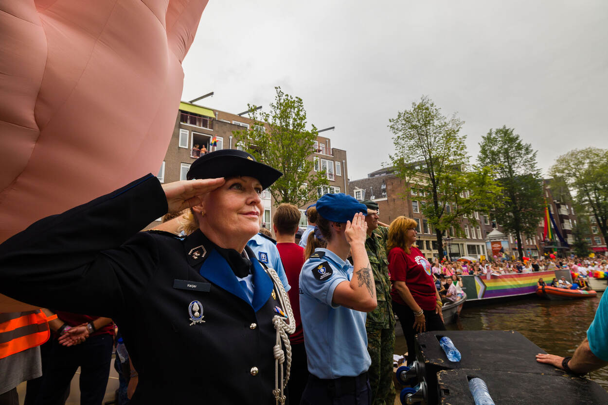 Een kleine honderd man staat breed grijnzend aan boord. De boot is versierd met vrolijke toeters en bellen en op de rode T-shirts van de burgermedewerkers prijkt een gekleurde wereldbol. En dan salueren de militairen allemaal tegelijk naar de mensenmassa aan de andere kant van het water, die luidt juicht en applaudisseert. Defensie was dit jaar voor de twaalfde keer van de partij op Pride Amsterdam, om te laten zien dat je bij deze organisatie jezelf kan zijn.