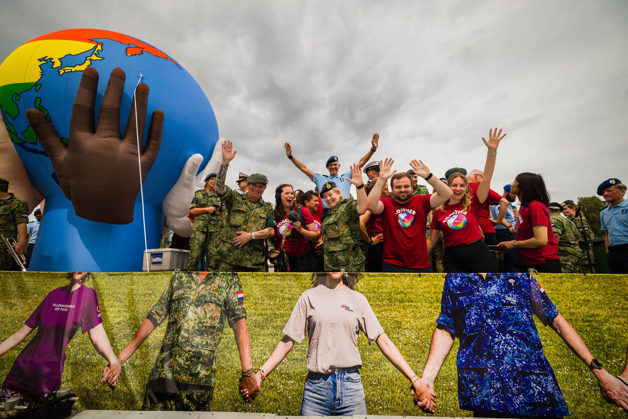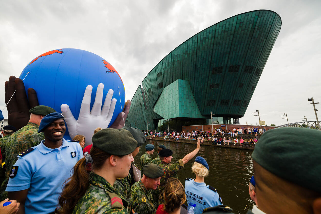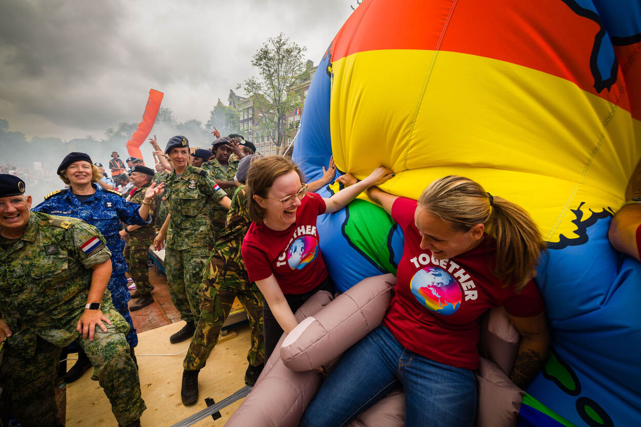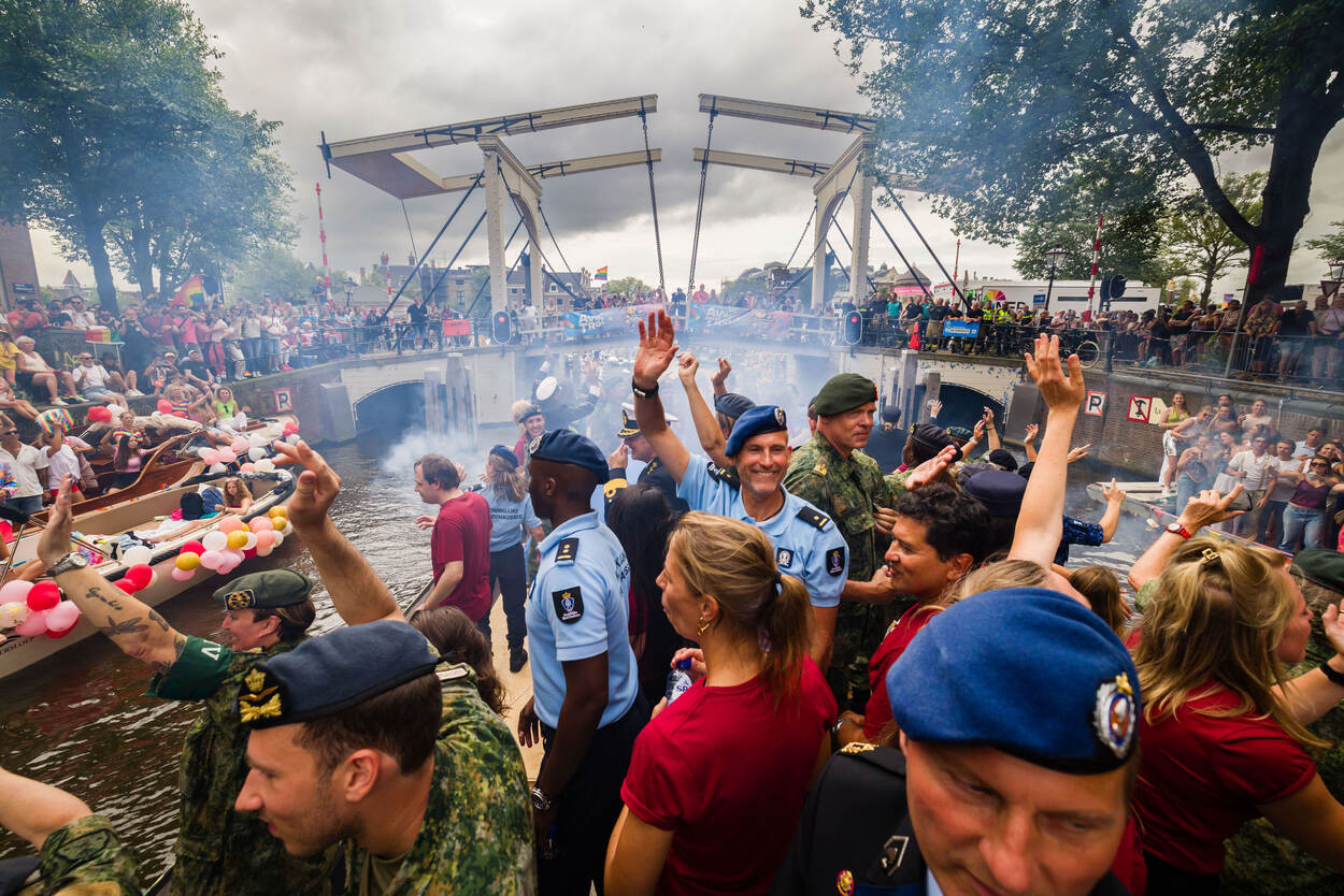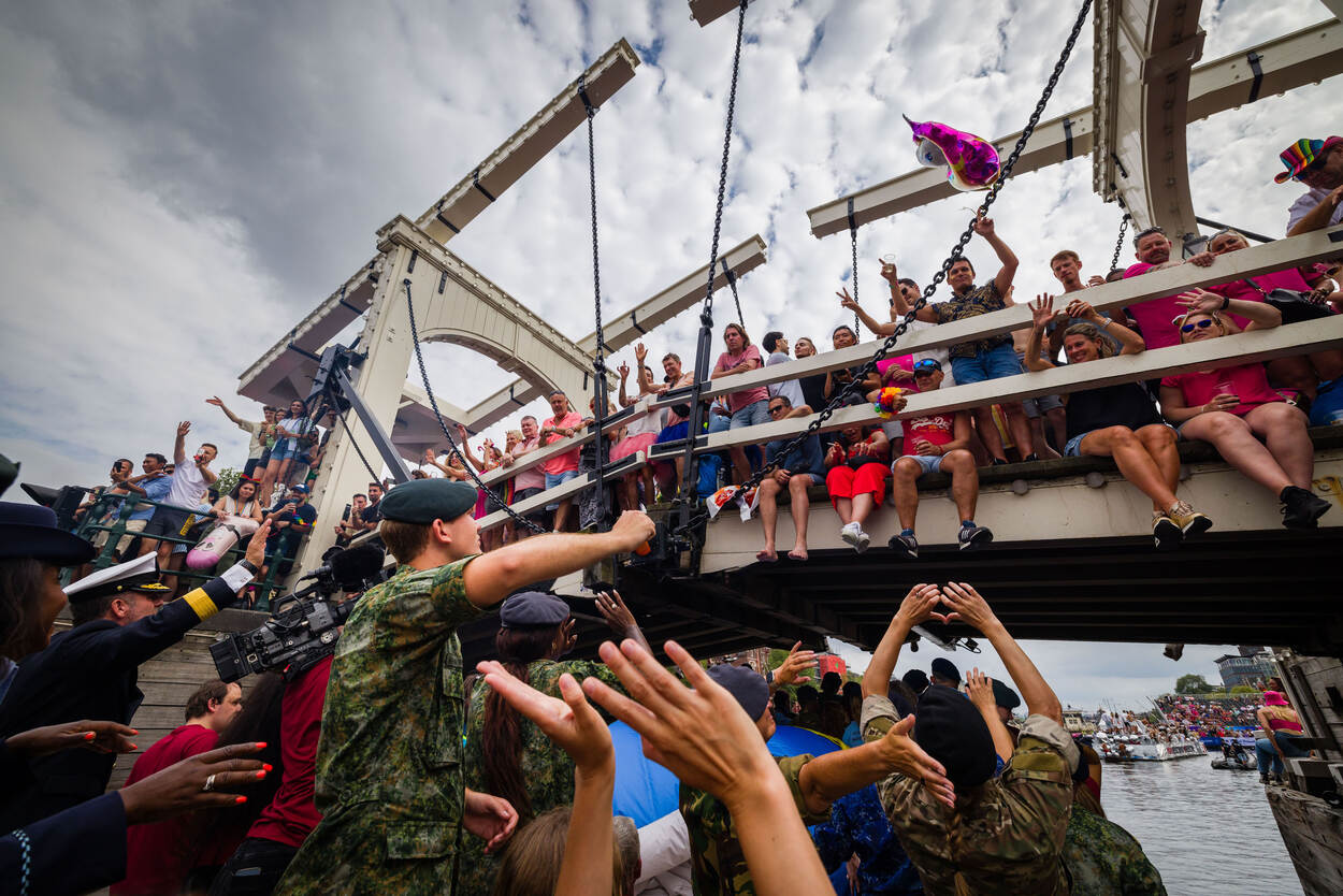 Een kleine honderd man staat breed grijnzend aan boord. De boot is versierd met vrolijke toeters en bellen en op de rode T-shirts van de burgermedewerkers prijkt een gekleurde wereldbol. En dan salueren de militairen allemaal tegelijk naar de mensenmassa aan de andere kant van het water, die luidt juicht en applaudisseert. Defensie was dit jaar voor de twaalfde keer van de partij op Pride Amsterdam, om te laten zien dat je bij deze organisatie jezelf kan zijn.