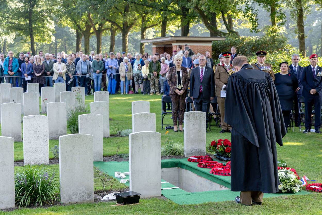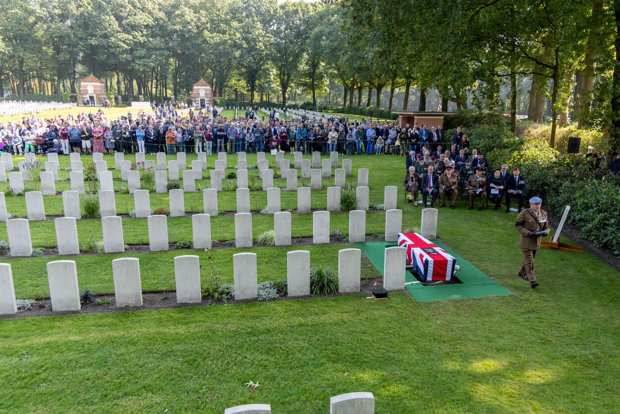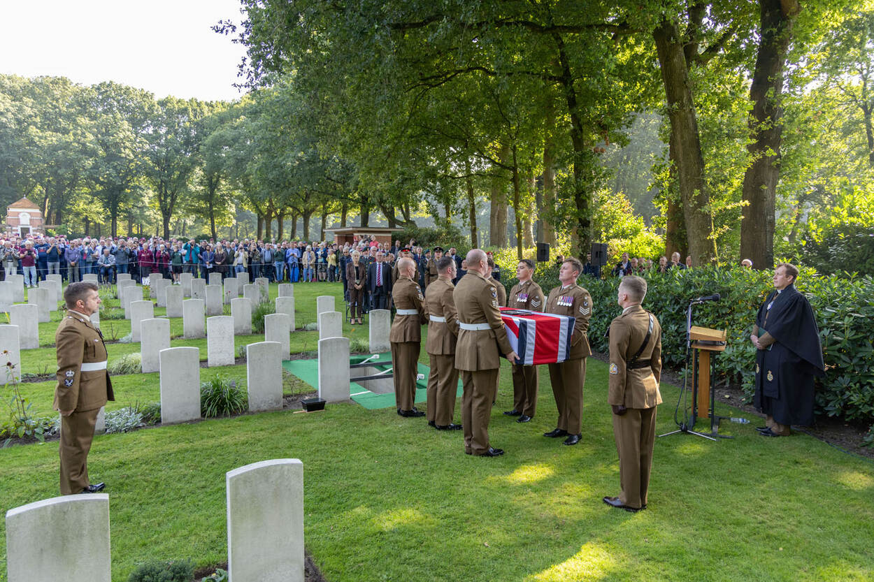 Er zijn de afgelopen decennia veel meer herbegrafenissen geweest van oorlogsslachtoffers. Met nog zesduizend vermisten op Nederlands grondgebied zullen die van deze week niet de laatste zijn. Toch is de plechtigheid van afgelopen woensdag bijzonder te noemen. “We hebben deze twee militairen begraven in de week voorafgaand aan tachtig jaar vrijheid en de herdenking van Market Garden. Daarbij was luitenant Dermod Anderson onderdeel van de luchtcomponent (codenaam Market) en soldaat Henry Moon van het grondoffensief (codenaam Garden)”, benadrukt kapitein Geert Jonker, commandant van de Bergings- en Identificatiedienst Koninklijke Landmacht (BIDKL).