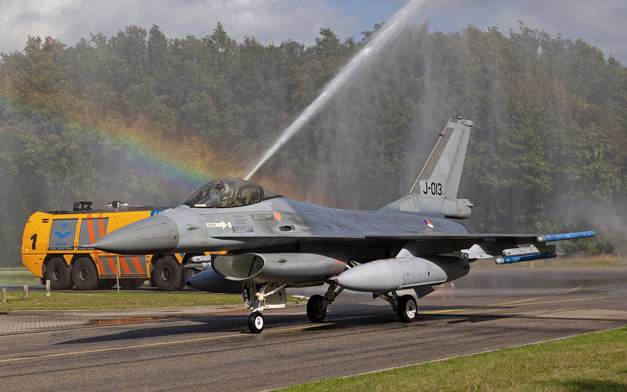 Bert van der Linden wilde het voor geen goud missen; afgelopen dinsdag keerde de J-013 als laatste naar de flightline terug na de laatste operationele vlucht van F-16’s in Nederlandse dienst. Het was tevens de fini flight van de vlieger; zijn laatste vlucht. Het traditionele watersaluut van de brandweer leverde een kleurrijk plaatje op.