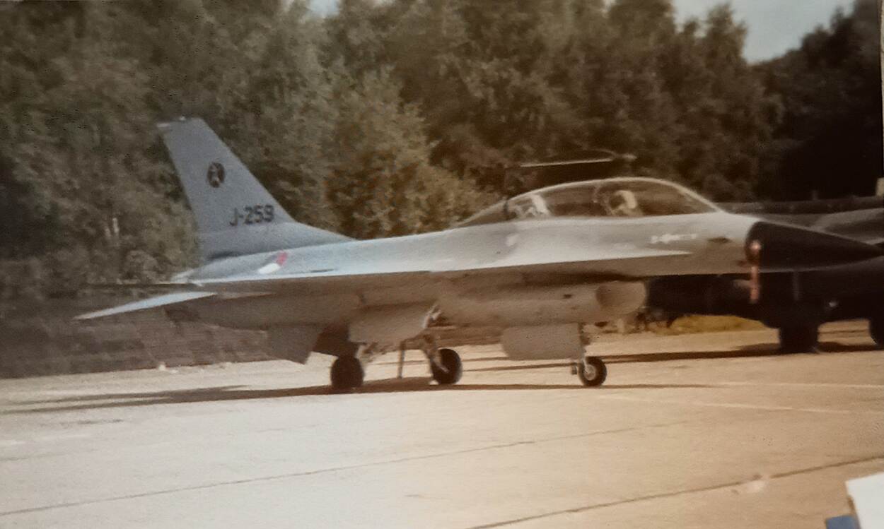 Theo Fleuren leverde een foto van de allereerste F-16 (J-259) in ons land. Tijdens een open dag in 1979 op Vliegbasis Twenthe was die hét pronkstuk. De eerste vlucht met de J-259 vond op 3 mei 1979 plaats. Kenmerkend aan het uiterlijk van de Nederlandse trots waren de toen nog grote roundels en de zwarte radarneus.