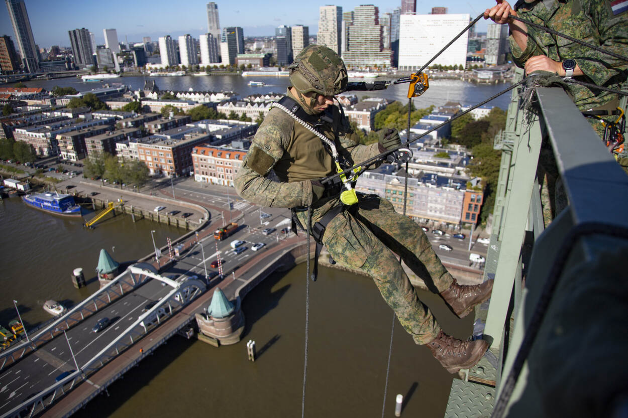 Hans van Lierop maakte deze ‘duizelingwekkende’ foto tijdens de opleiding van mariniers op de Hef in Rotterdam, de bijnaam voor de Koningshavenbrug. Het abseilen was onderdeel van de eindoefening FINEX van Korps Mariniers, die werd afgesloten met een mars.