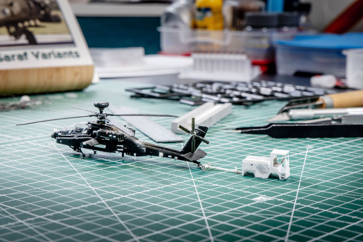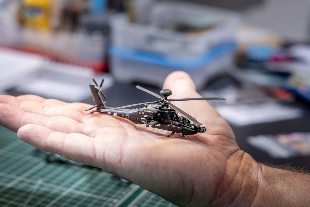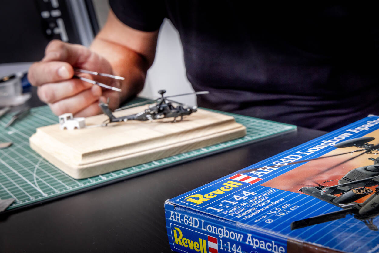 Daarbij klopt ieder detail. “Als basis gebruik ik de plastic modelbouwdozen die breed verkrijgbaar zijn. Maar vaak zijn die onderdelen te simplistisch weergegeven. Dus modificeer ik ze. Zo ontstaan levensechte minikopieën van plastic.” Als voorbeeld neemt hij de uitlaten van een Apache Delta (Longbow)-bouwdoos. “In de bouwdoos zijn die massief aan de achterkant, je kunt er niet inkijken. Maar in werkelijkheid zijn ze hol. Zoiets is een doorn in m’n oog, dus heb ik ze uitgehold.”