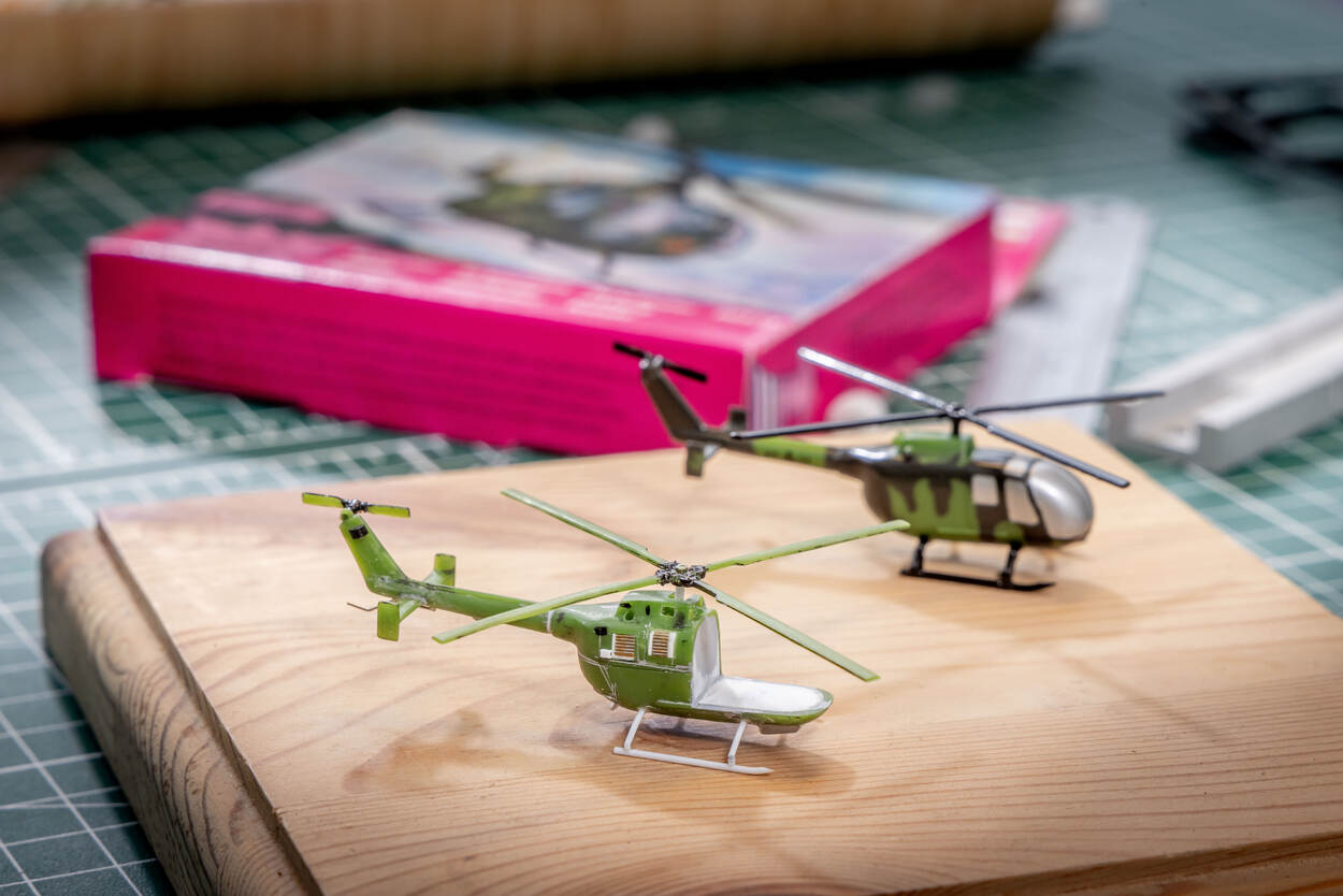 Nog geen van de modellen is volledig af. “Ik ben met alles tegelijkertijd bezig, omdat het me om het bouwen gaat. Niet om het eindresultaat.” Hij doelt bijvoorbeeld op de Bölkow Bo-105: “Hier is op ‘mijn’ schaal wel een simpel bouwdoosje van verkrijgbaar, maar die is erg eenvoudig weergegeven. De doelgroep van dit doosje waren ook kinderen in de leeftijd van ongeveer zeven jaar. Dus heb ik de neus er van afgehaald en ben ik hem van zelfgemaakte onderdelen nu aan het opbouwen en detailleren. Ook breng ik lood aan, zodat het model niet op zijn staart gaat staan. Die uit het bouwpakket doet dat wel.”