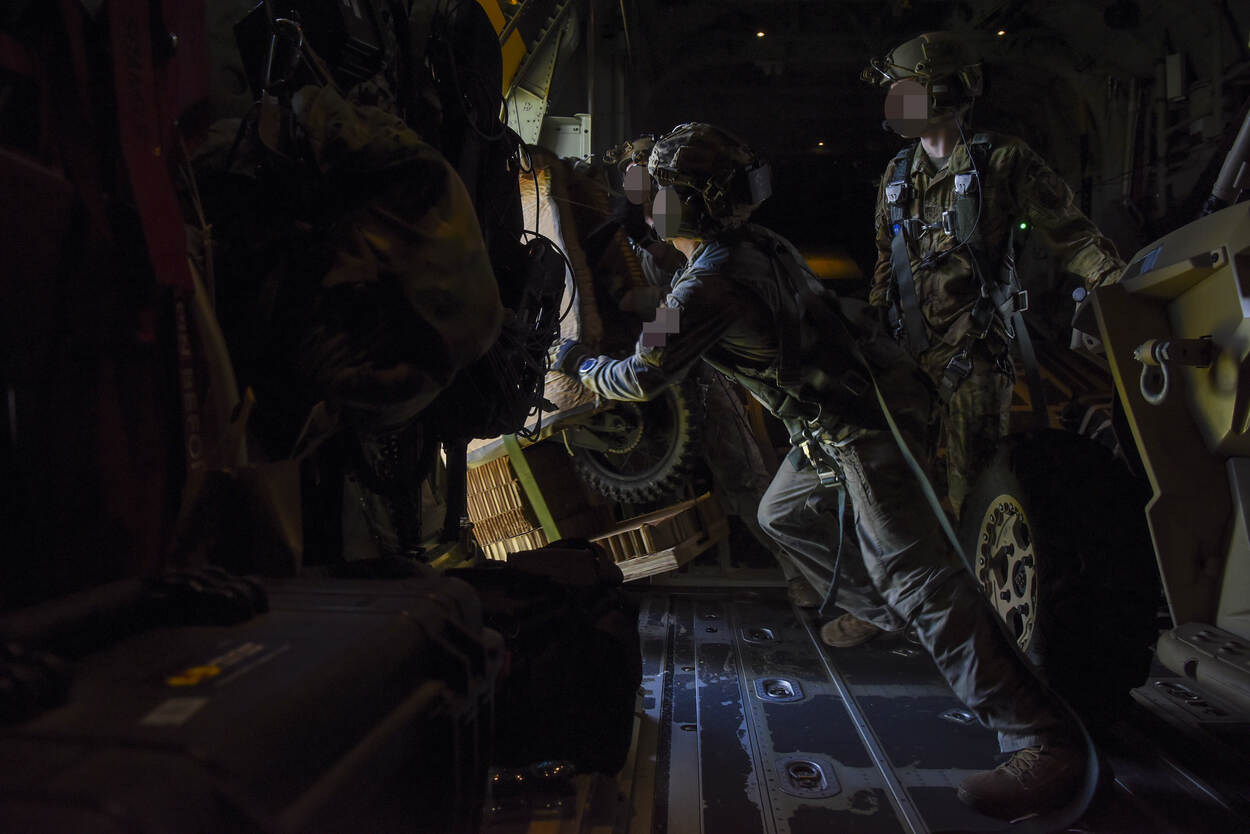 Loadmasters van het 67th Special Operations Squadron van de Amerikaanse luchtmacht duwen een motorfiets uit een C-130J Commando II . Het voertuig gaat aan een parachute naar buiten tijdens een Special Operations Air Land Integration (SOALI)-oefening in Letland. Sergeant Timothy Moore van de US Air Force hield de camera vast. Opmerkelijk: ook de Amerikaanse strijdkrachten zijn begonnen met het blurren van de gezichten van hun militairen op de foto’s.