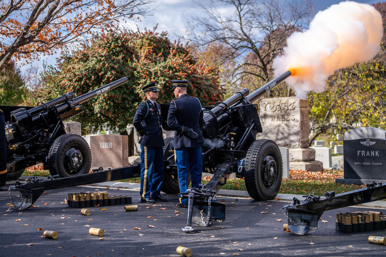 Amerikaanse soldaten van de Presidential Salute Battery vuren een M5, een ceremonieel kanon, af. Op 11 november worden ieder jaar 21 saluutschoten afgevuurd op de militaire begraafplaats Arlington National Cemetery (Virginia). Bij het graf van de Onbekende Soldaat zijn vervolgens kransleggingen. In het Amphitheater is aansluitend een toespraak van de president, dit jaar de laatste van Joe Biden. (Foto US Army/korporaal Christopher Grey)