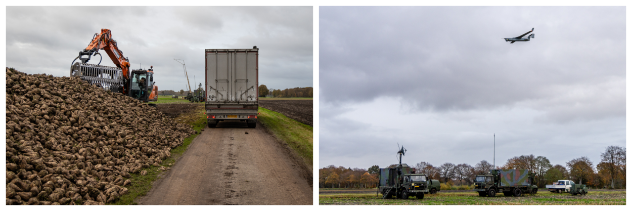 Volgens Martin zoekt de batterij net als heel Defensie naar meer plekken om zichtbaar te zijn voor het publiek. Voor stedelingen onder de lezers: onder de neus van de militairen was de (suiker)bietencampagne in volle gang, zoals te zien op deze op verzoek aangeleverde prent van Martin. En hij had al zoveel keus. Kijk maar eens op https://defensiefotografie.nl/oefeningen/verkenningsvliegtuig-boven-drenthe/