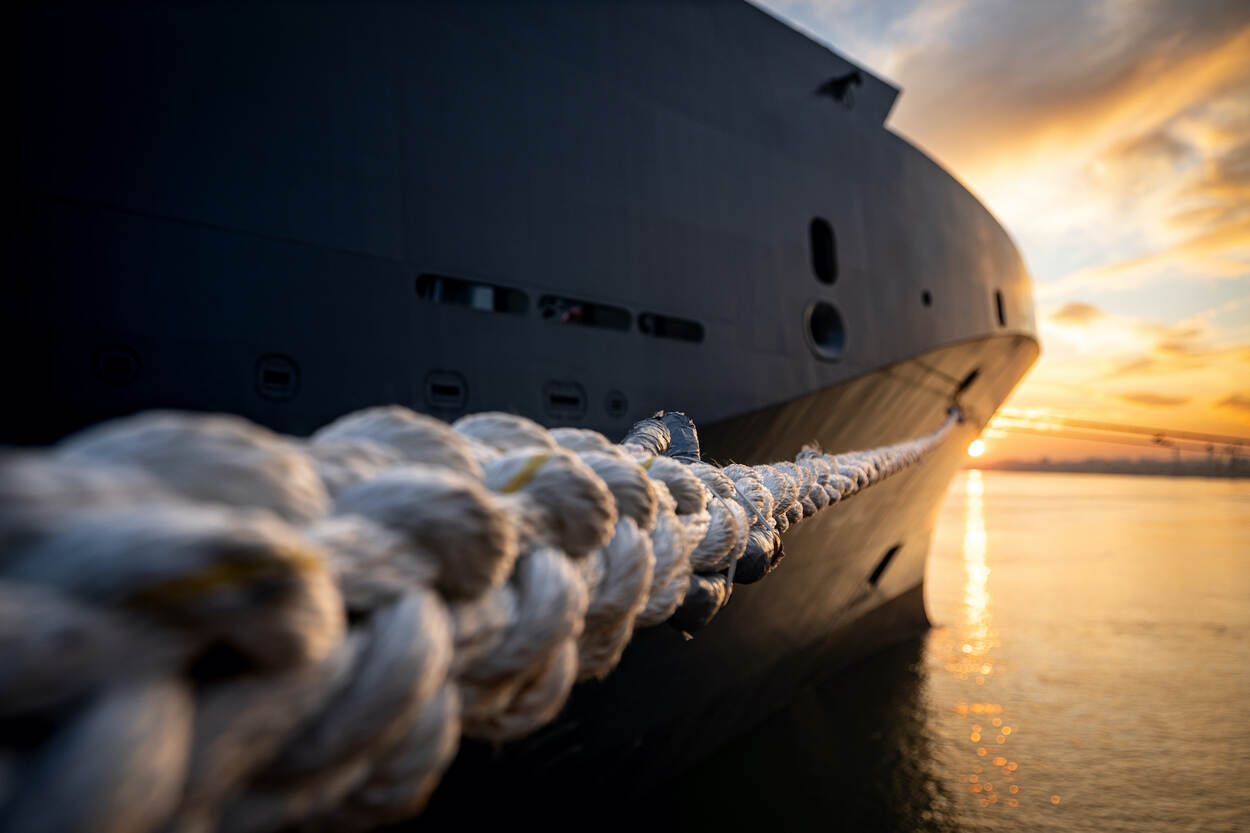 close-up van de trossen waarmee het CSS vastligt aan de kade, terwijl de zon zakt.