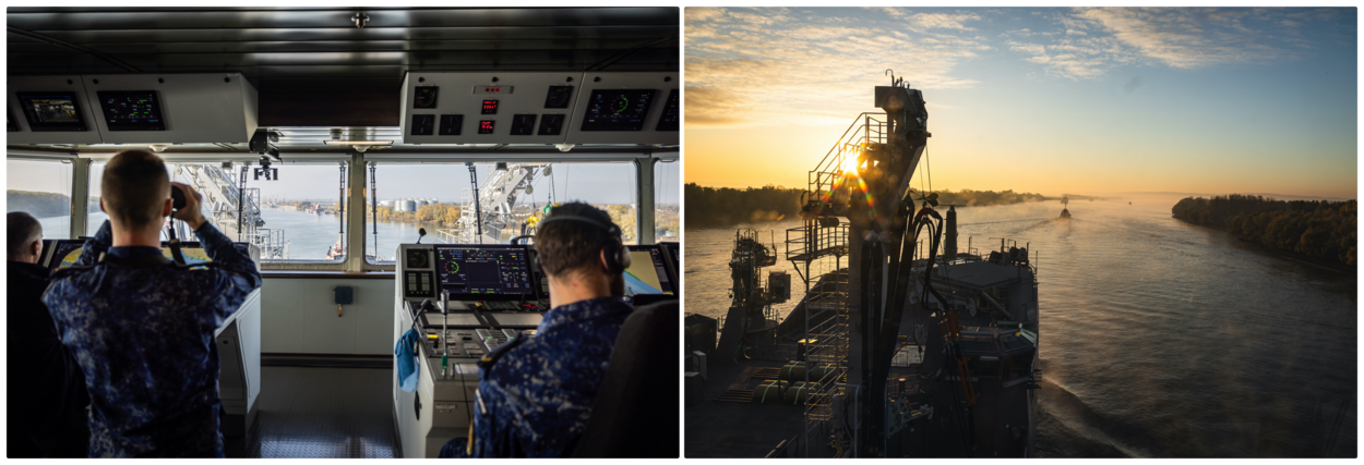 bemanning op de brug houdt omgeving in de gaten en zicht op de boeg van de Den Helder tijdens een oranje lucht.