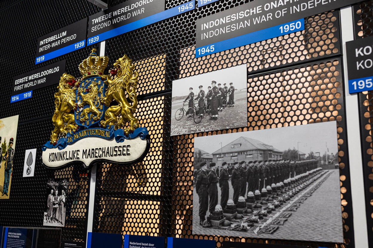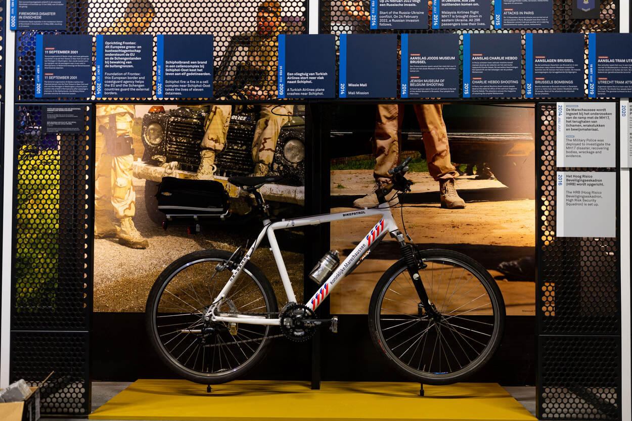 De belangrijkste gebeurtenissen uit de geschiedenis van de marechaussee zijn te zien op een grote tijdlijn die een hele wand in beslag neemt. Aan de hand van foto’s, maar ook objecten wordt de bezoeker meegenomen in de geschiedenis en de ontwikkeling van de marechaussee. Zo is de fiets te zien van de marechausseecollega die nog net op tijd weg kon duiken tijdens de aanslag op De Naald in Apeldoorn tijdens Koninginnedag 2009. Aan het eind van de tijdlijn prijkt het jaar 2030, de toekomst dus. “We hebben bewust een stukje opengelaten, omdat de marechaussee altijd door blijft ontwikkelen.”