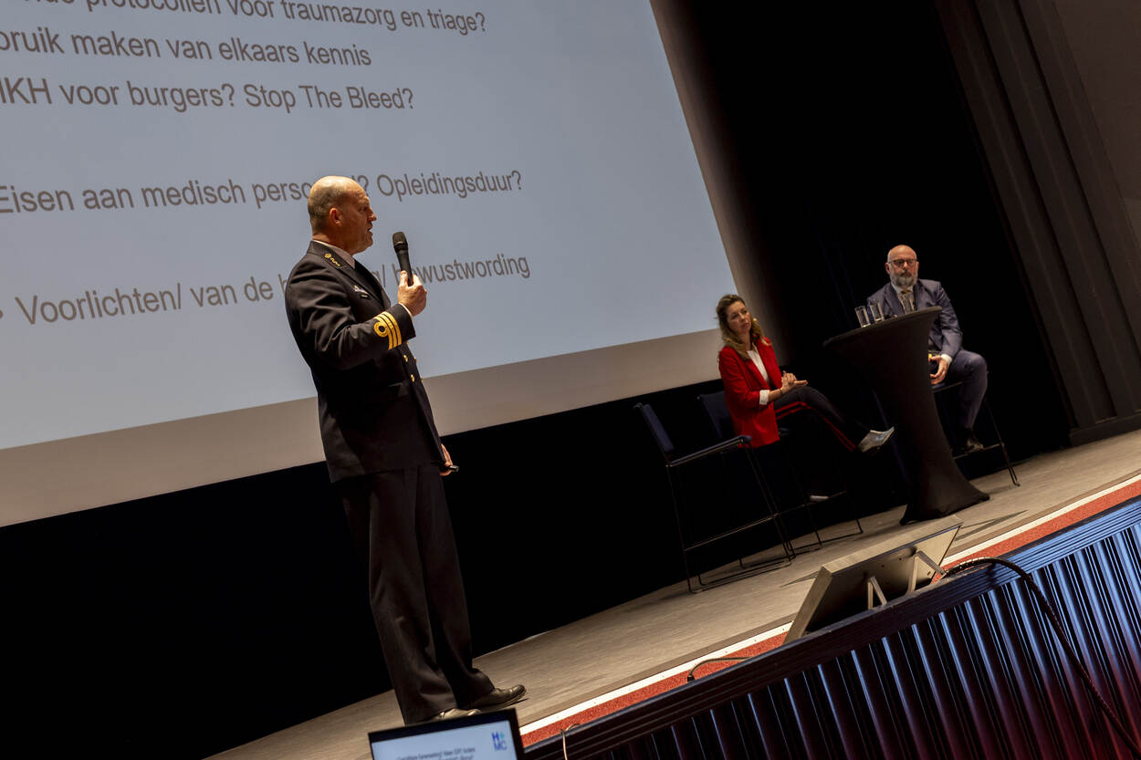 Dat de samenwerking tussen de verschillende partijen van groot belang is, daar hoef je in de zaal eigenlijk niemand van te overtuigen. De vraag is alleen hoe die eruit moet zien. Daarbij kunnen we volgens generaal Maas veel leren van de Oekraïners, waar het gezondheidszorgsysteem vanwege de oorlog al jaren onder druk staat. Bijvoorbeeld door zowel vooraf als tijdens medische behandelingen te kijken wat daar gebeurt. “Daarbij moeten we ons realiseren dat veiligheid geen exclusief militair probleem is, maar een uitdaging voor onze hele samenleving.”