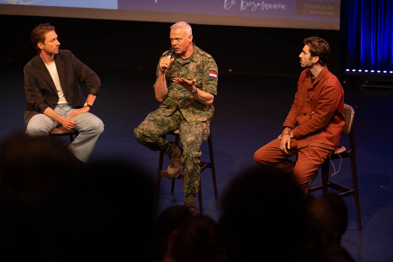 Militair met microfoon in de hand zit op barkruk op het podium van een theater. Links en rechts van hem zitten twee mannen in burgerkleding op een barkruk.