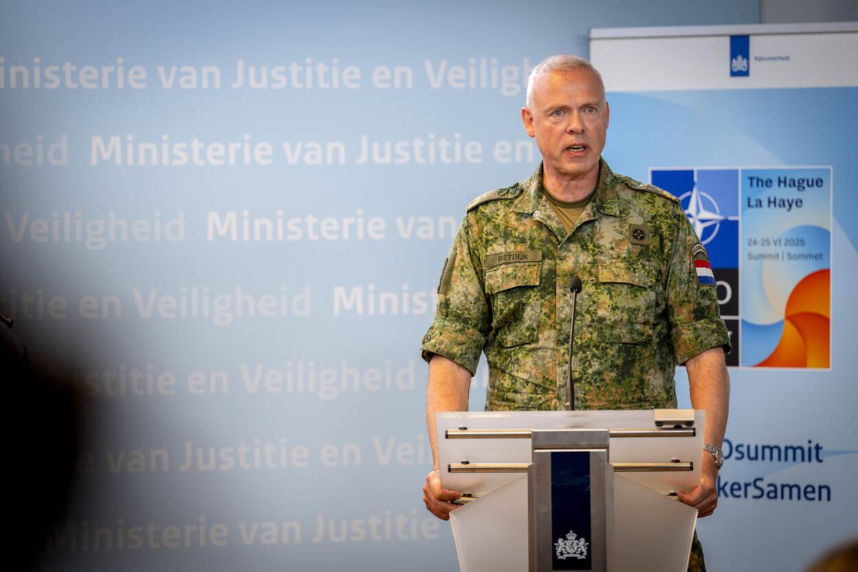 Generaal-majoor Wilfred Rietdijk staat de pers te woord tijdens de veiligheidsbriefing.