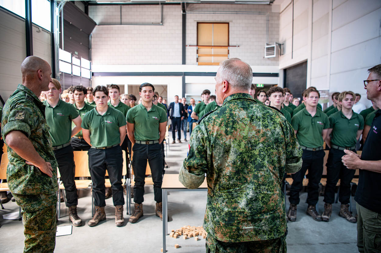 De aanwezige mbo-studenten marcheren de ruimte binnen en staan keurig in de houding. Daarna komen de Commandant der Strijdkrachten (CDS) en Krijgsmachtadjudant binnen. Nadat de CDS het commando ‘rust’ heeft gegeven, ontspant de zaal en gaat iedereen zitten. De presentatoren van De Kiesmannen, Dylan en Jochem, starten de les.
