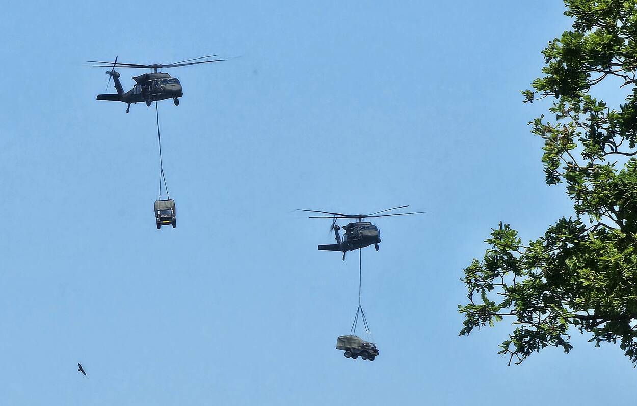 De tweede bijdrage aan deze rubriek van Assenaar Wim Veldman komt logischerwijs ook van die grote oefening van 13 Infanteriebataljon Luchtmobiel en het Defensie Helikopter Commando: Falcon Spring. Daaraan deden ook Amerikaanse helikopters, Chinooks en Black Hawks mee. Op de foto droppen een Nederlandse en een Amerikaanse CH-47 (bijnaam ‘Big Windy’) militairen en goederen bij de Ossensluis nabij De Wijk oftewel De Wiek zoals ze in Drenthe zeggen.