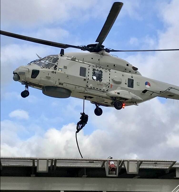 Wéér een helikopter! Dat was de eerste gedachte bij het zien van deze foto van sergeant van de mariniers Pieter. Maar dit gaat niet om een bijdrage van het Defensie Helikopter Commando aan de al diverse keren genoemde oefening Falcon Spring. Deze NH90 legde deze regelmatige inzender vast tijdens een oefening van de special forces van de mariniers bij Vlissingen-Oost. Zij beoefenden, zo meldt Pieter, “het boarden van personeel via fastropen op een boorplatform.”