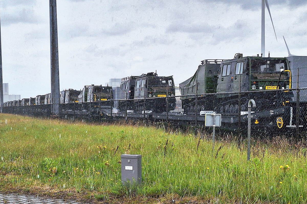 Voor foto’s vanuit de noordelijke provincie kun je gerust Harry Hulshof inschakelen. Hoewel, bij de grote oefening Falcon Spring moest hij door omstandigheden verstek laten gaan. Maar niet te veel getreurd; op 5 juni was hij op weg naar de Eemshaven om daar het vertrek van drie mijnenjagers naar Delfzijl te fotograferen. “Rijd je door het havengebied dan kom je ook langs het Defensiecomplex”, meldt hij. “Ik had al gezien dat het door Defensie ingehuurde schip New Amsterdam terug was uit noord-Noorwegen. Dat betekent dat er materieel is aangekomen in de haven. En dat bleek! Op het terrein stonden nog voertuigen en op de rails waren de wagons inmiddels beladen met een twintigtal Bandvagn 206 D6’s. Ik kwam er toch langs, dus ook maar even gefotografeerd.”