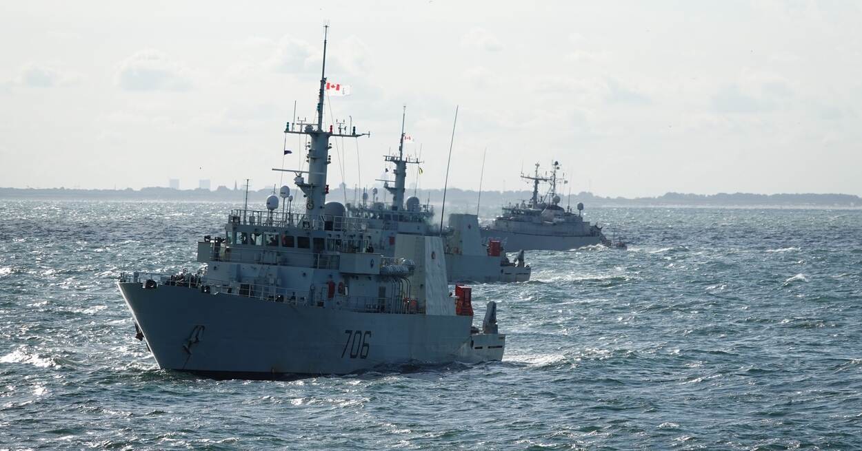 Ook de Standing Naval Mine Counter Measures Group 1 (SNMCMG1) deed mee, hier voor de kust van Zuid-Holland. Op de voorgrond de Canadese HMCS Yellowknife.