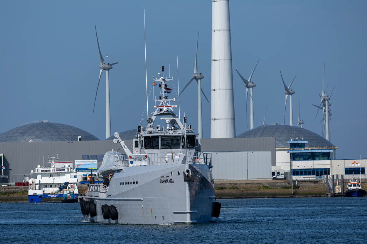 Van links naar rechts: het logo van Sandy Coast 2025, de oefening is aangestuurd van Zr.Ms. Nautilus, De Galatea is ingehuurd door de Koninklijke Marine en een RHIB raast over het water, met ‘het stopcontact van Nederland, de Eemsdelta, op de achtergrond.